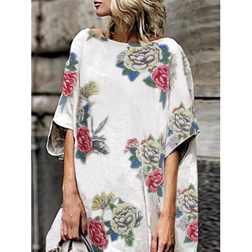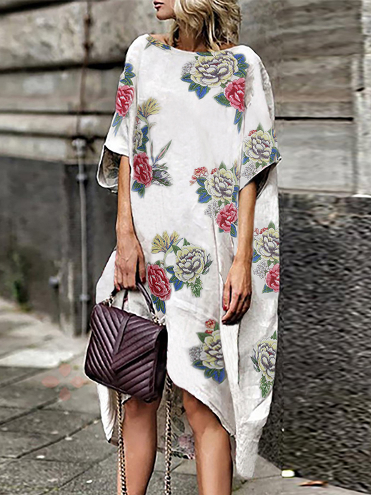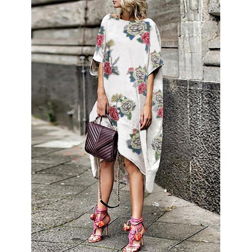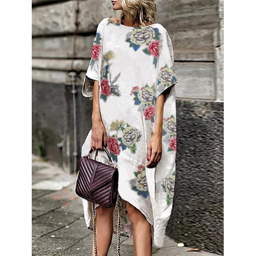 S-5XL Women Loose Floral Print Half Sleeve Irregular Hem Dress