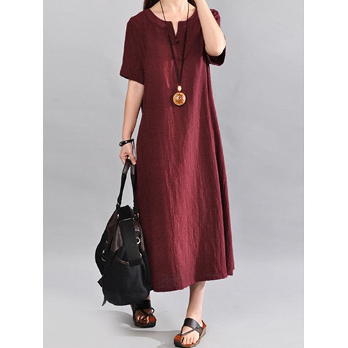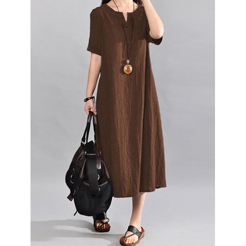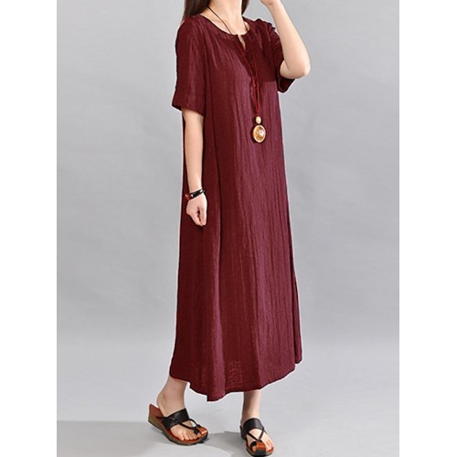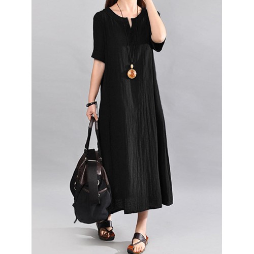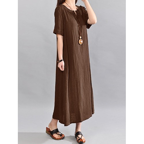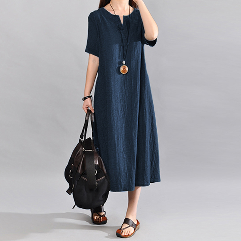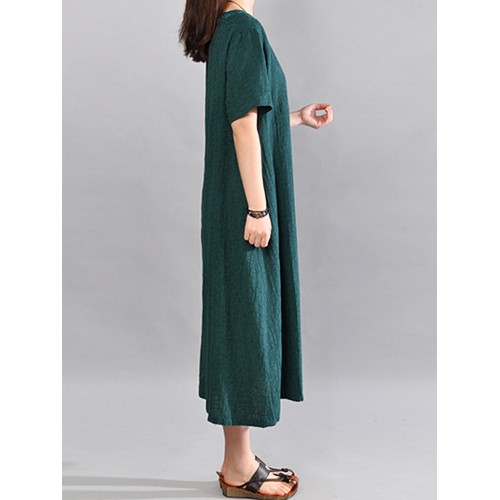 Women Vintage V Neck Short Sleeve Cotton Maxi Dress