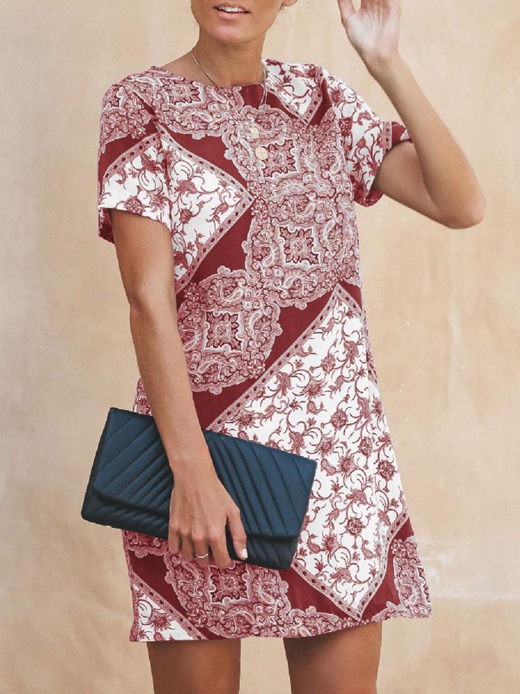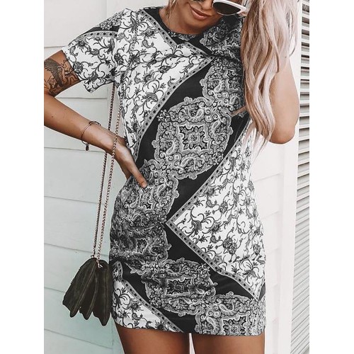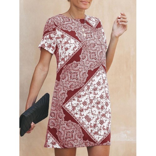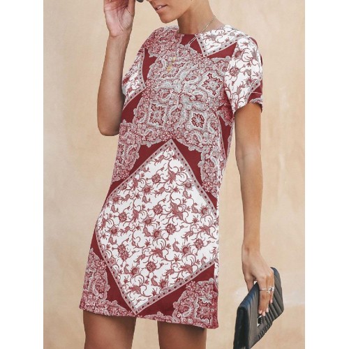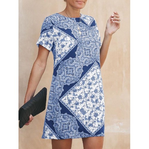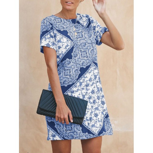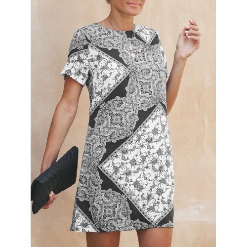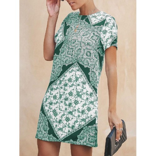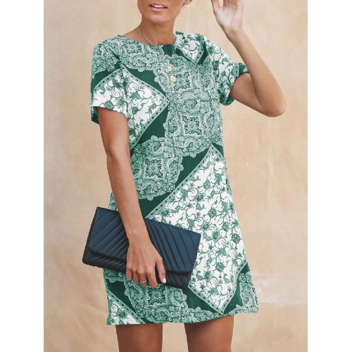 Women Short Sleeve Round Neck Floral Casual Mini Dress