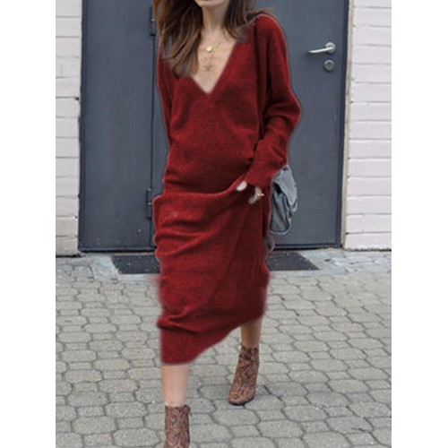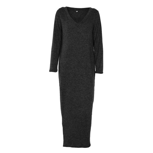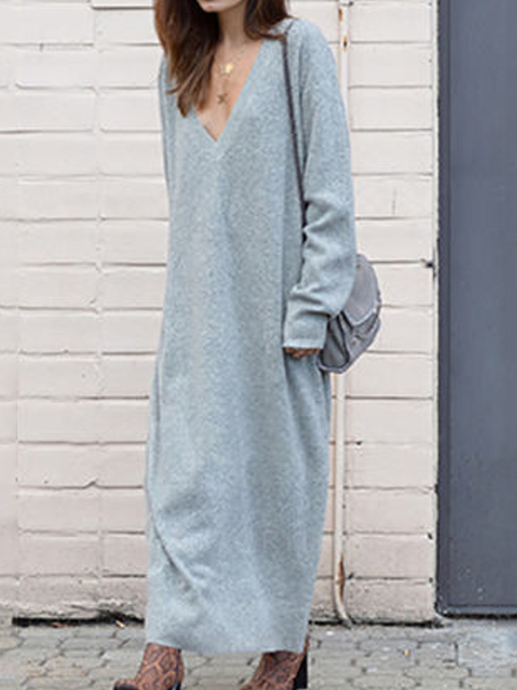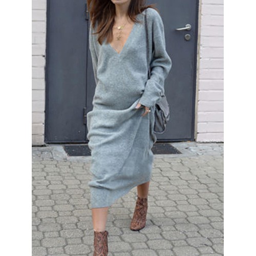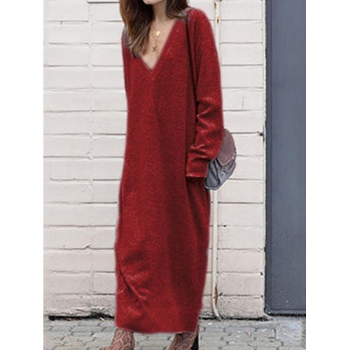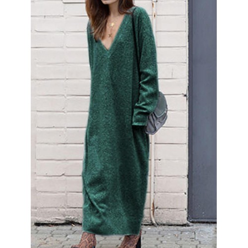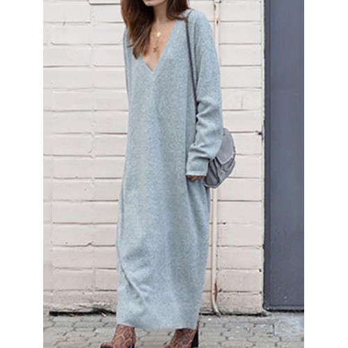 Women Long Sleeve V-neck Loose Casual Knitting Long Dress