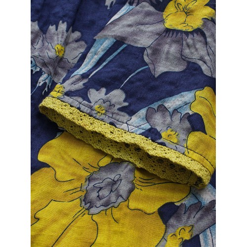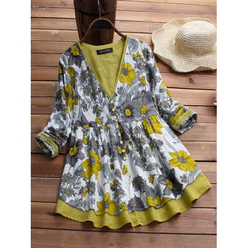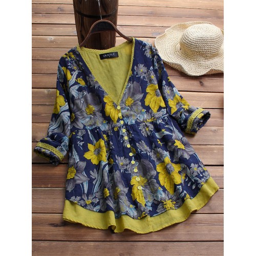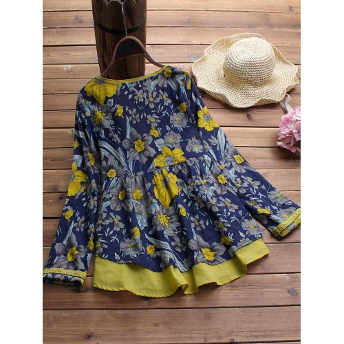Vintage Long Sleeve Floral Print V-neck Patchwork Blouse
