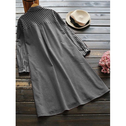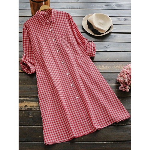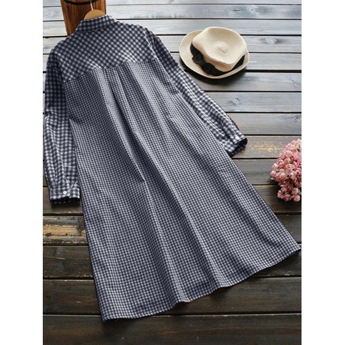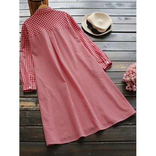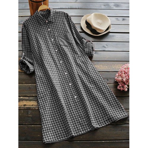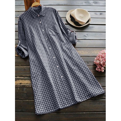 S-5XL Women Vintage Turn-Down Collar Plaid Blouse