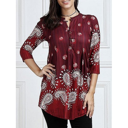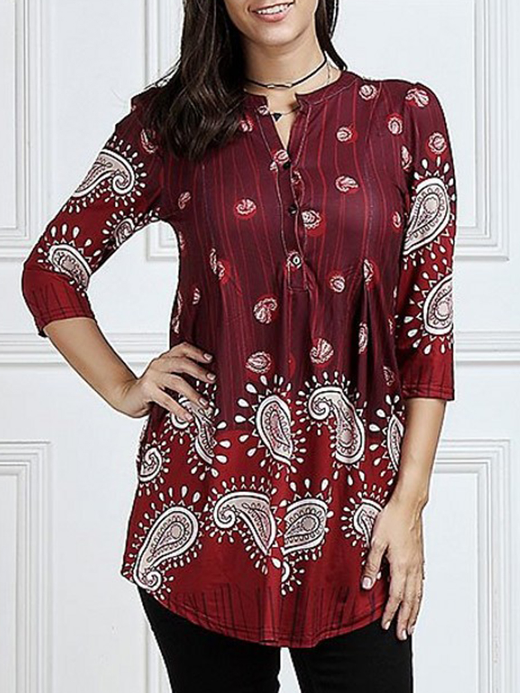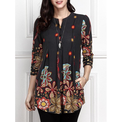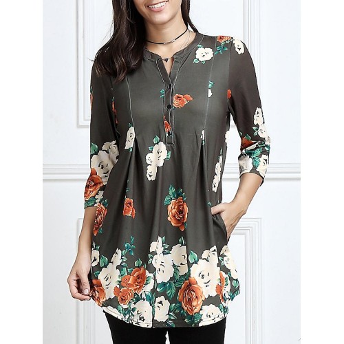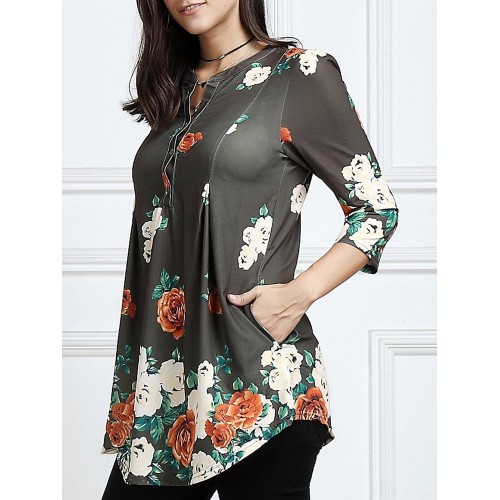 Women 3/4 Sleeve V-neck Irregular Floral Print Blouse