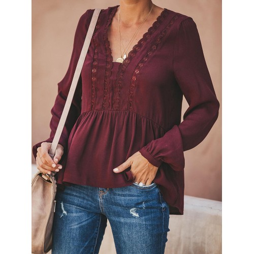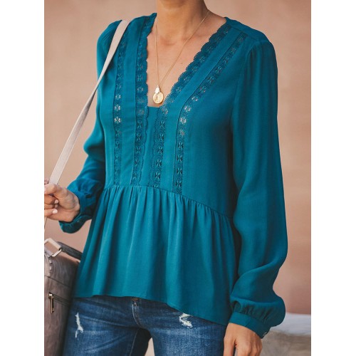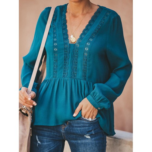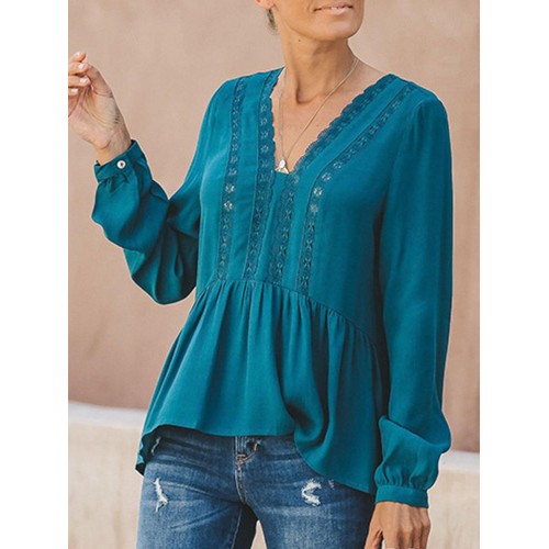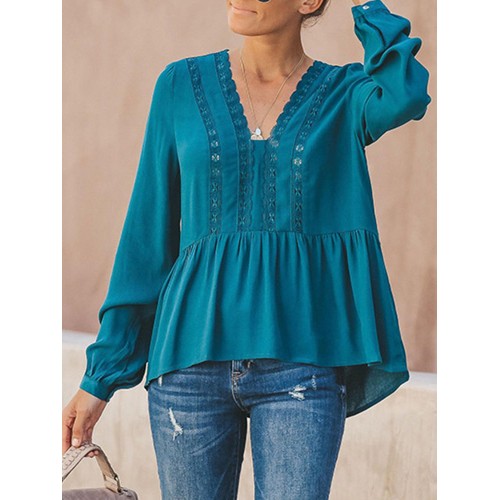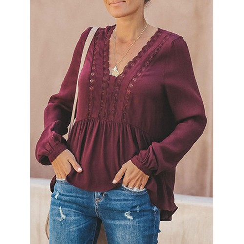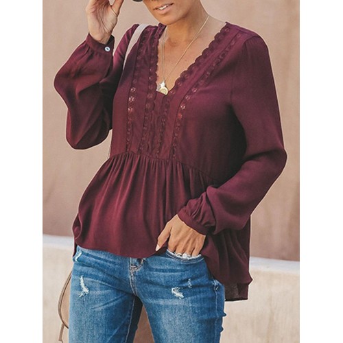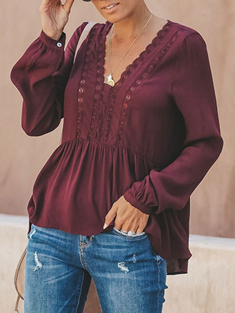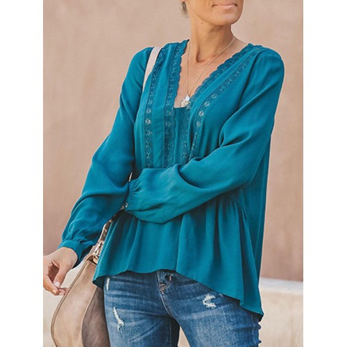 Women Casual Loose Pure Color V-Neck Lace Chiffon Blouse