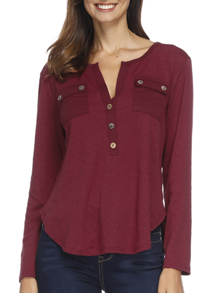 Women Casual Button V Neck Long Sleeve Irregular Hem Blouse