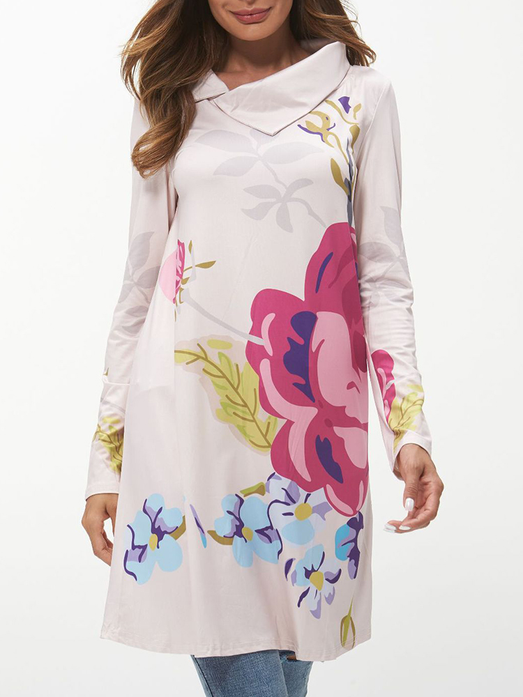 Women Casual Turtleneck Long Sleeve Floral Print Blouse
