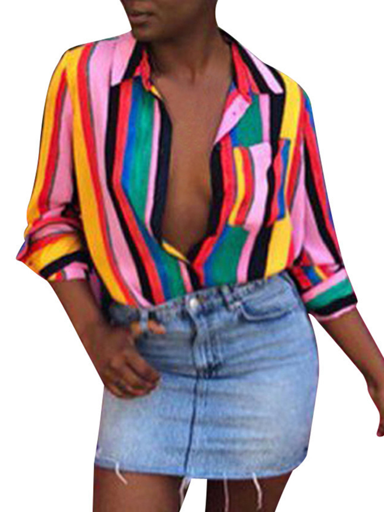 Women Rainbow Stripe V-neck Long Sleeve Blouse