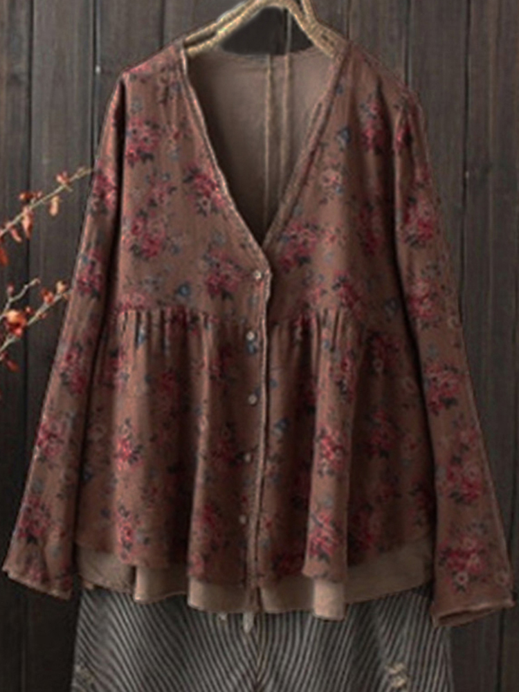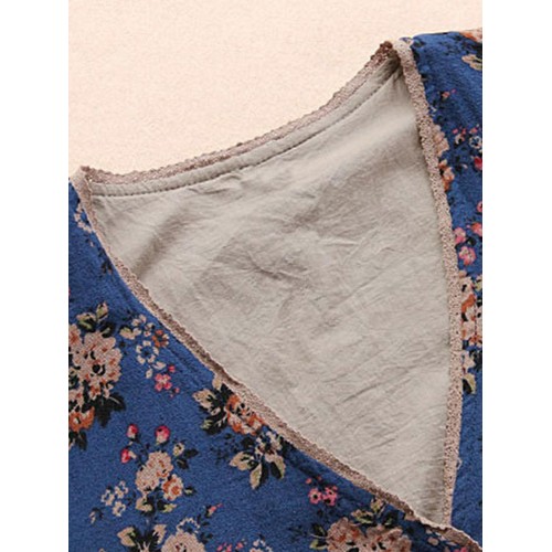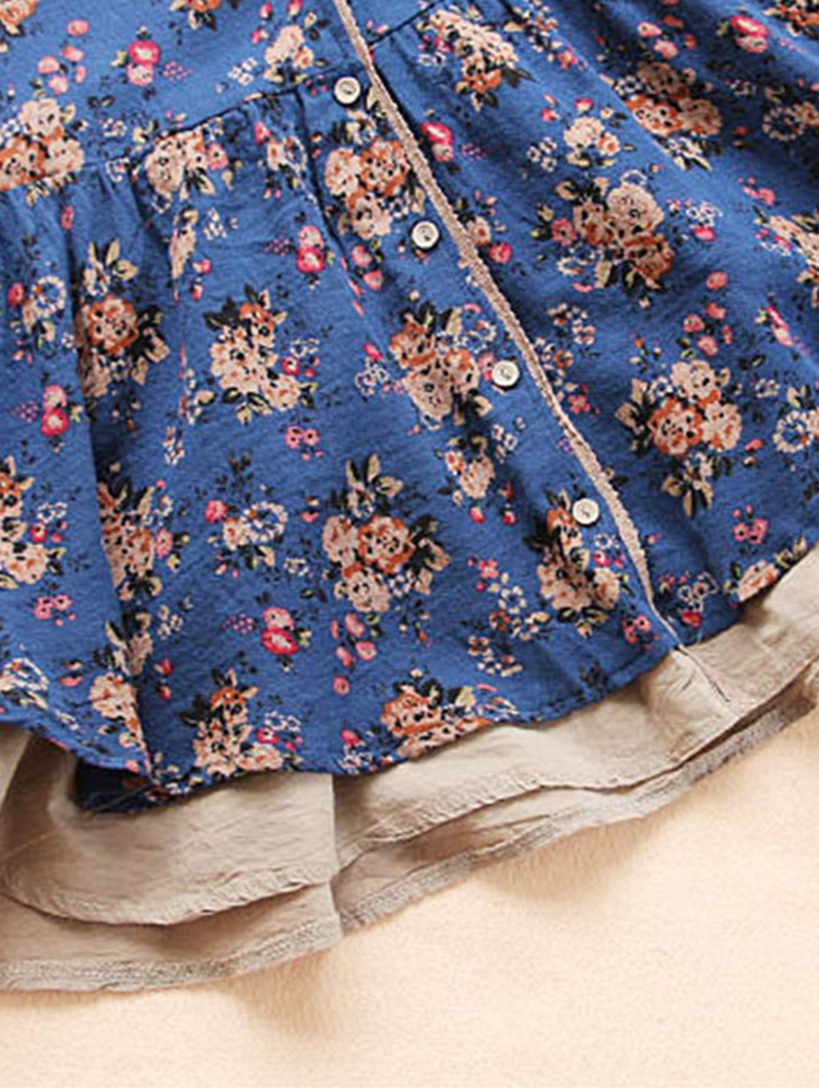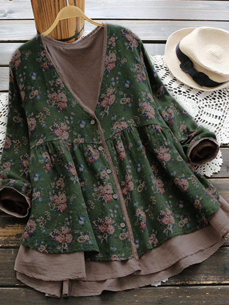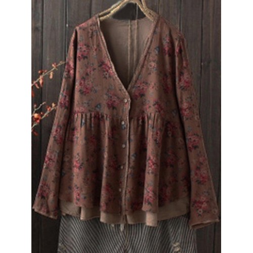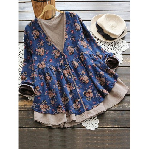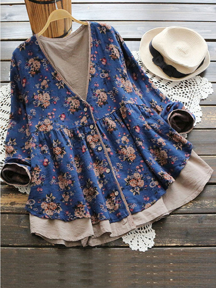 Vintage Women Floral V-Neck Cotton Linen Loose Button Blouse