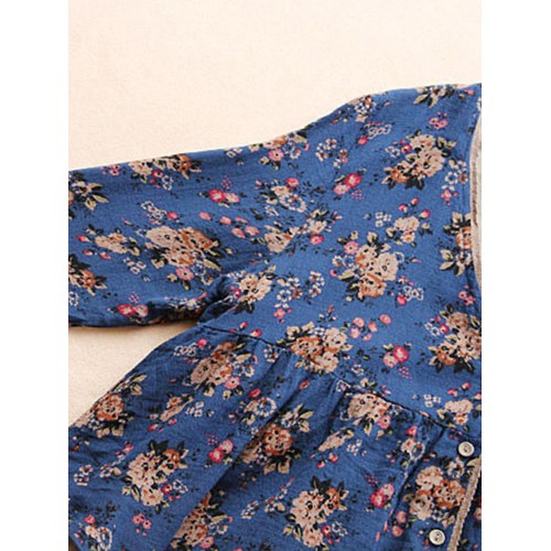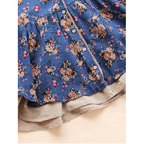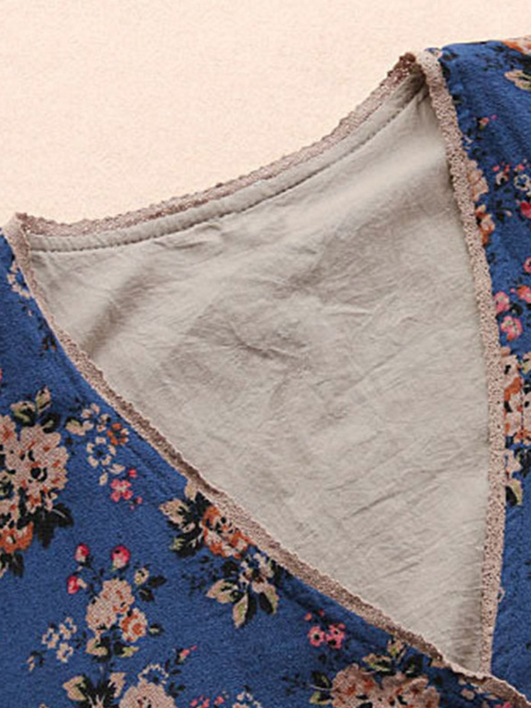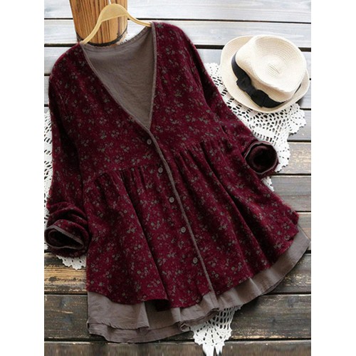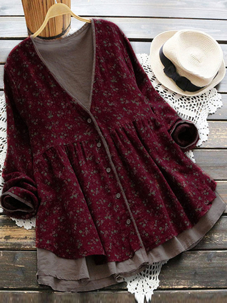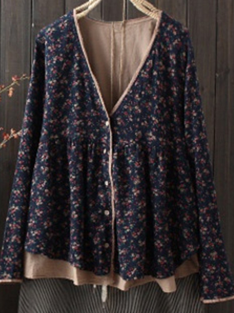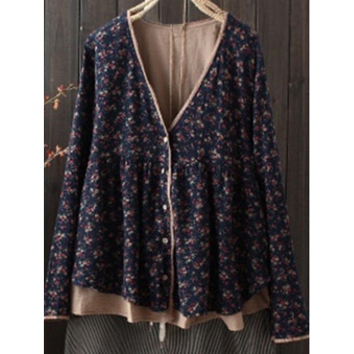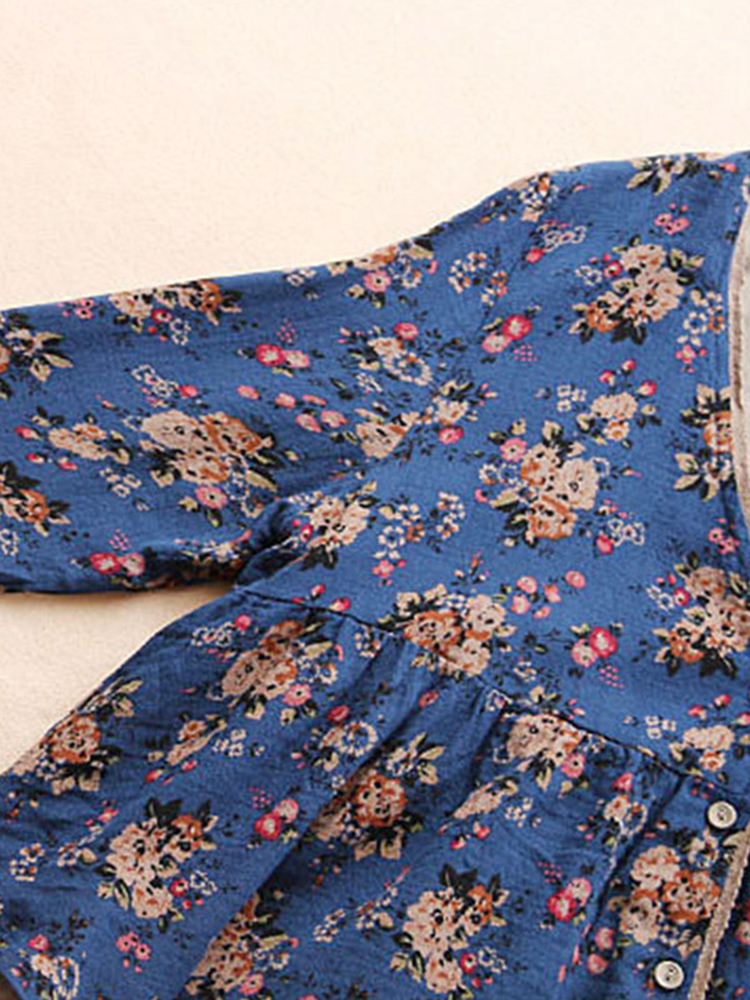 Vintage Women Floral V-Neck Cotton Linen Loose Button Blouse