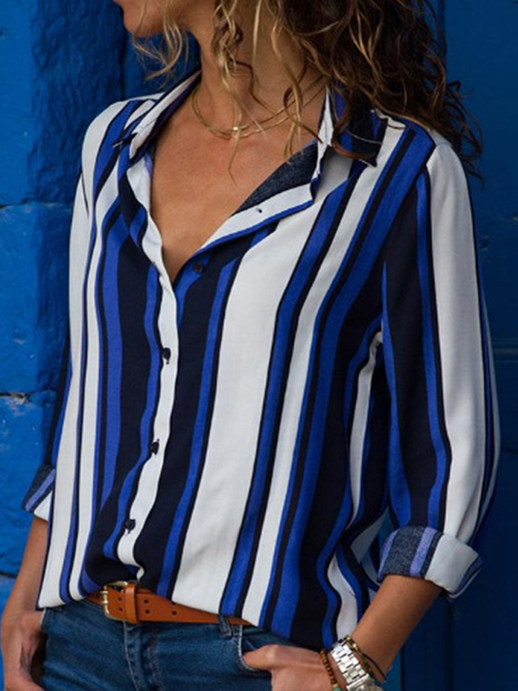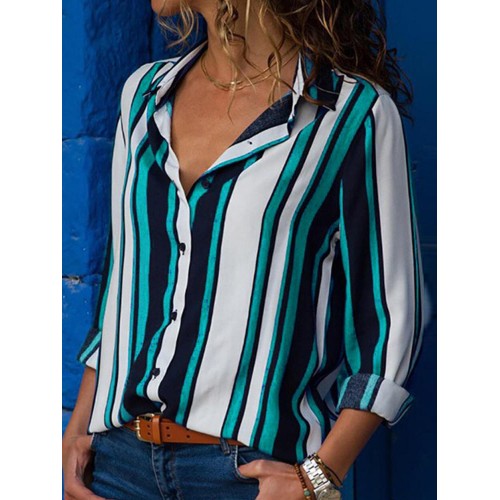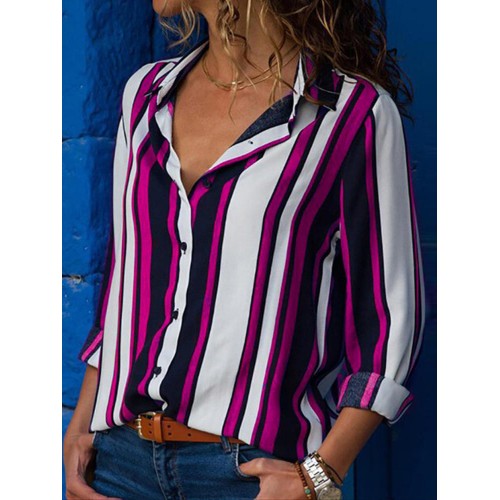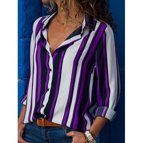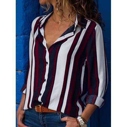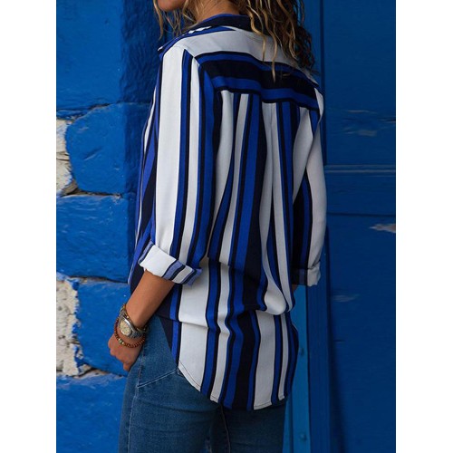 Women Long Sleeve Stripe V Neck Casual Loose Blouse