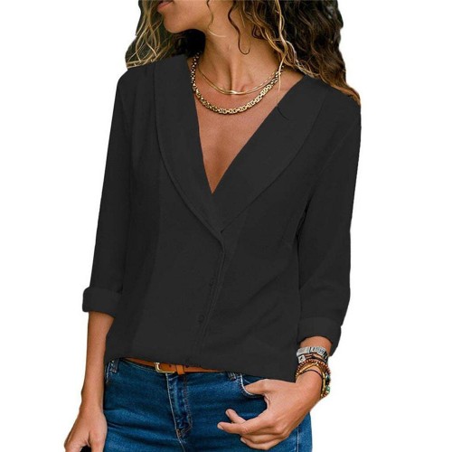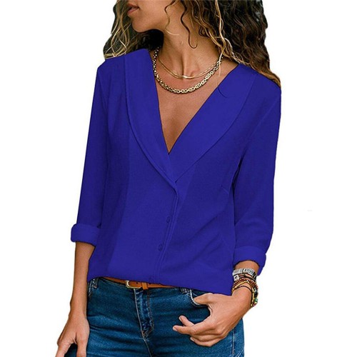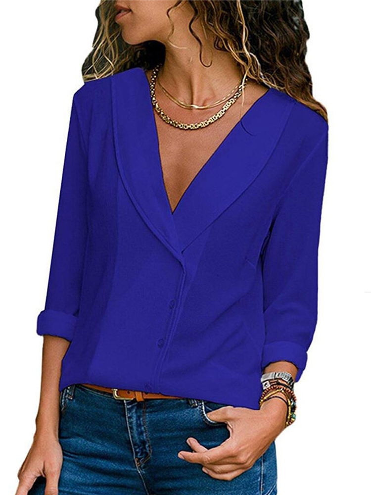 Women Long Sleeve V Neck Chffon Button Loose Solid Blouse