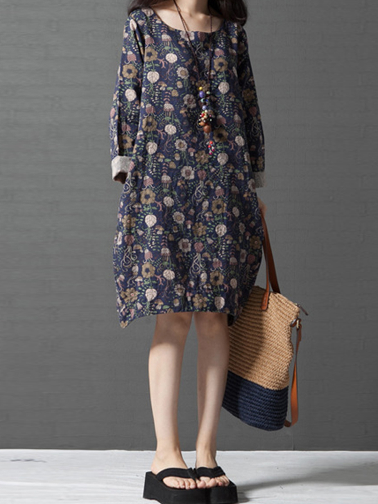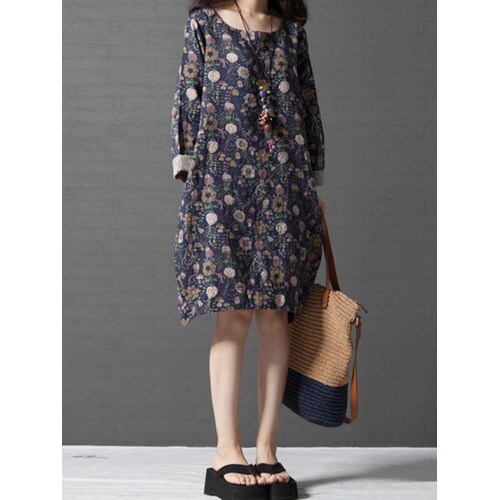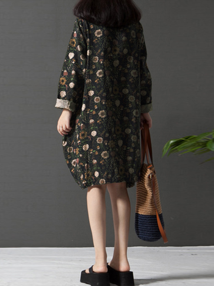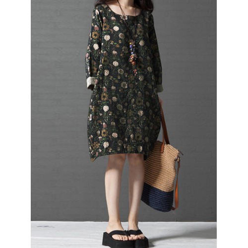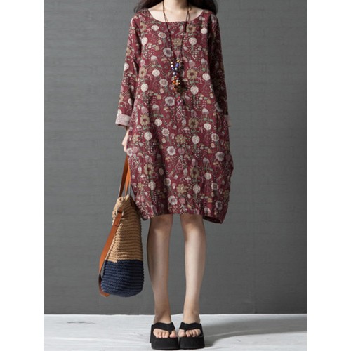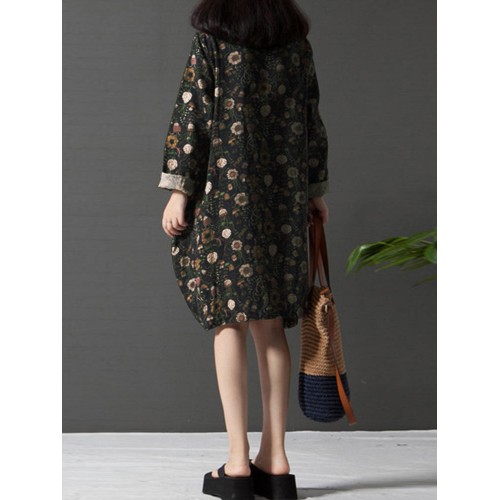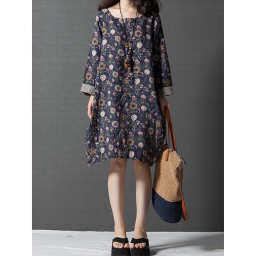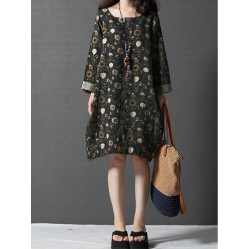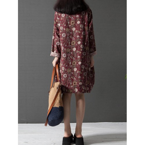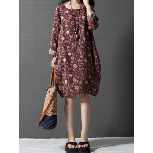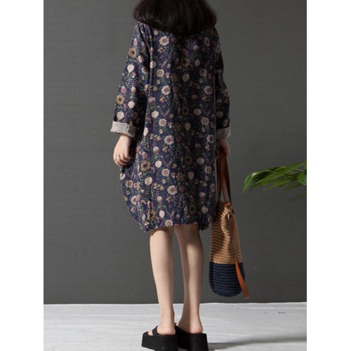S-5XL Women Long Sleeve Floral Print Ethnic Mini Dresses
