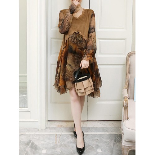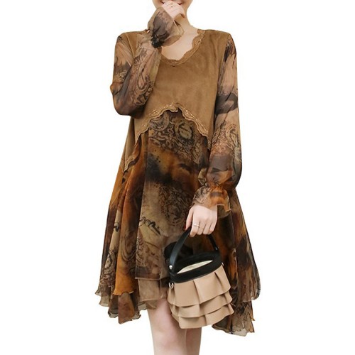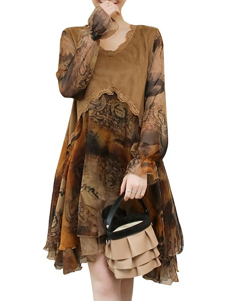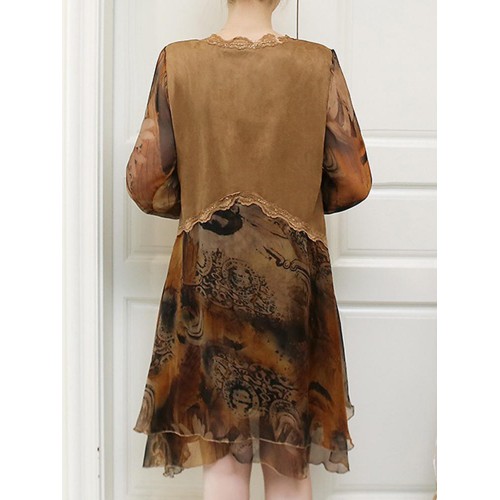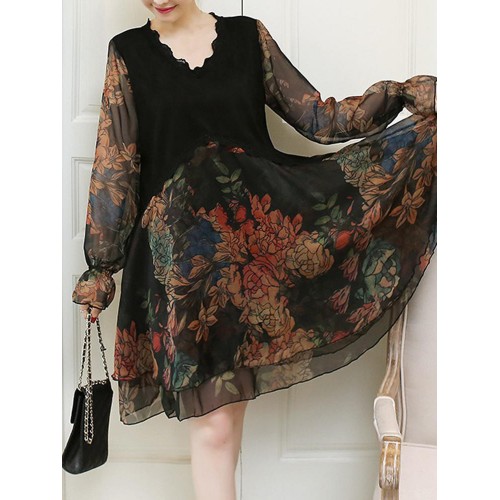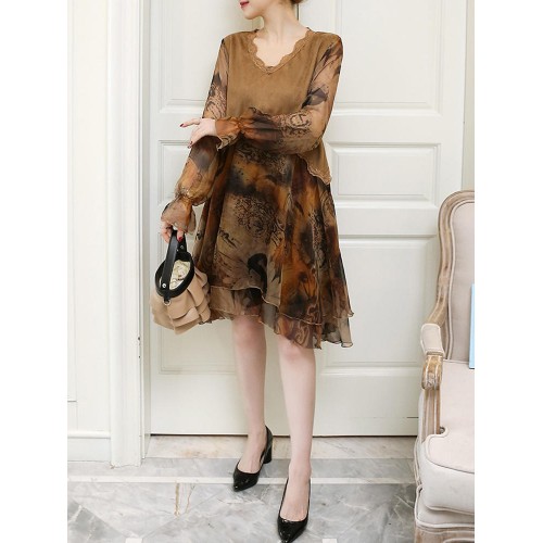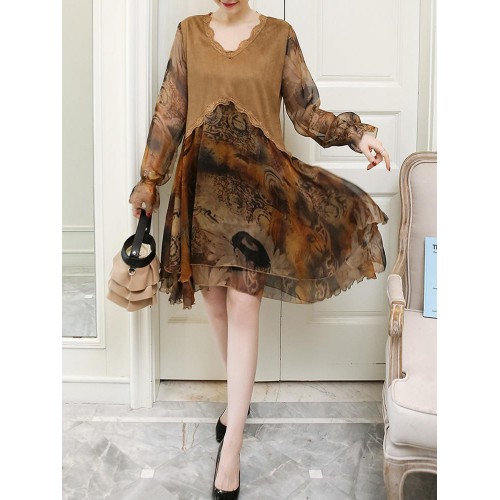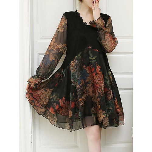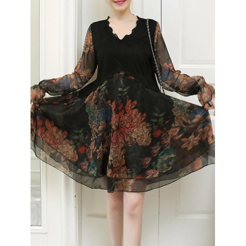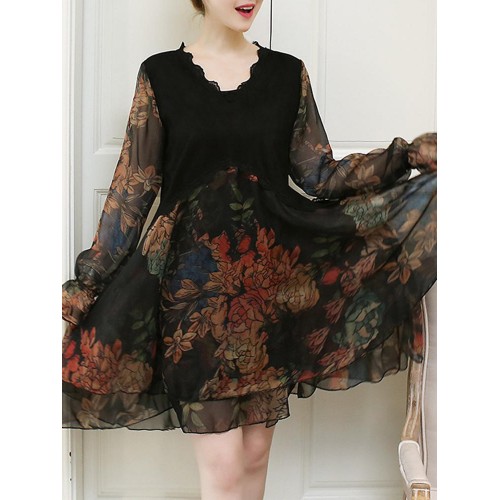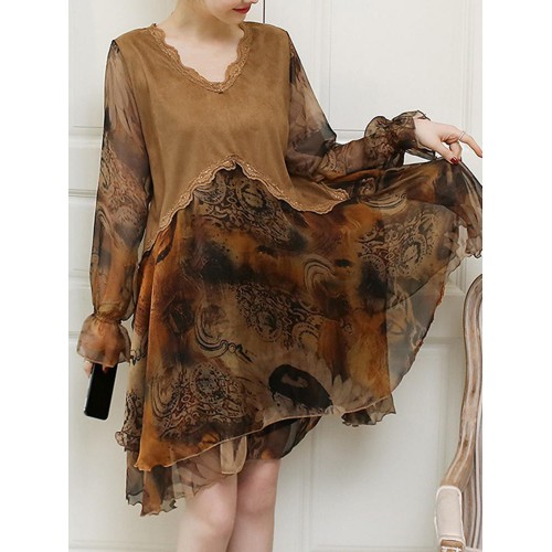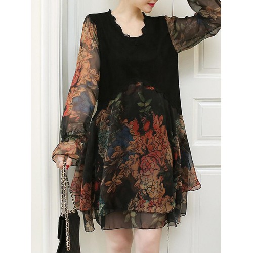 Women Long Sleeve Lace Patchwork Floral Print Mini Elegant Dress