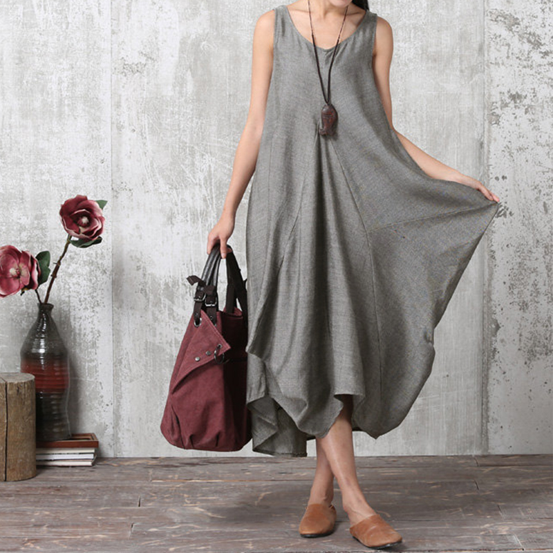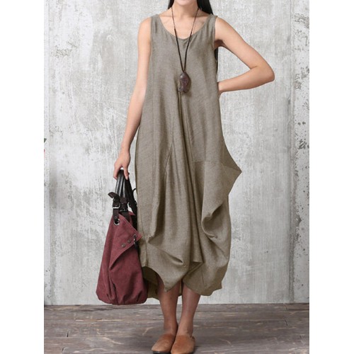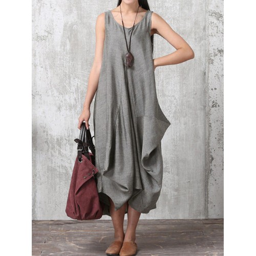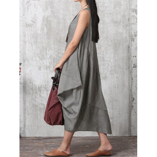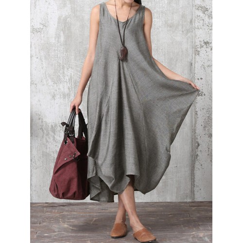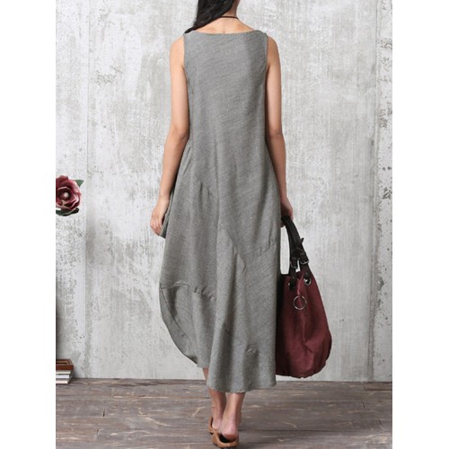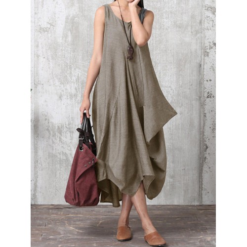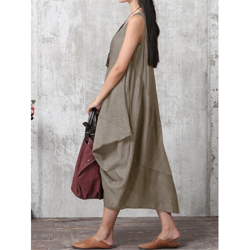 Women Casual Sleeveless V Neck Asymmetric Maxi Dress