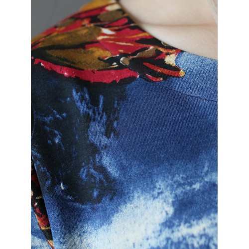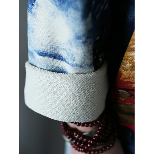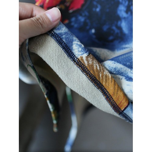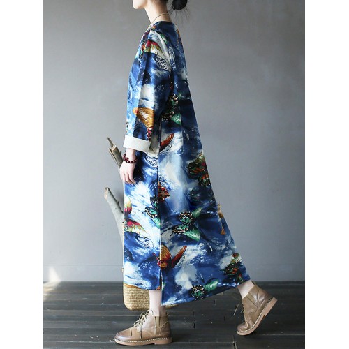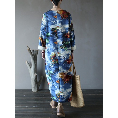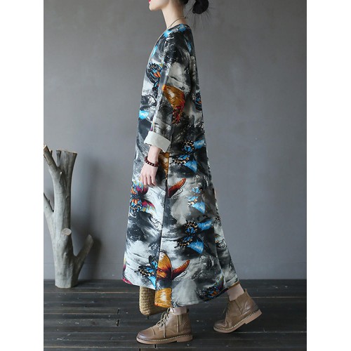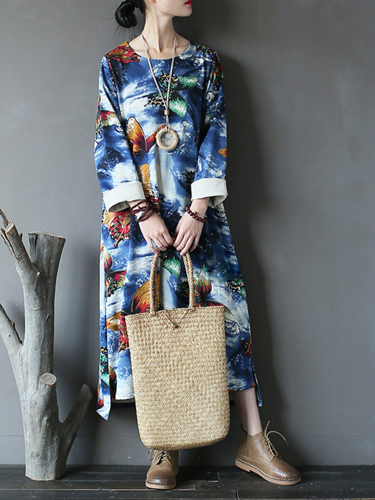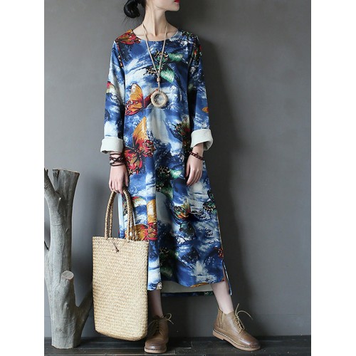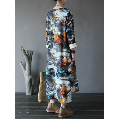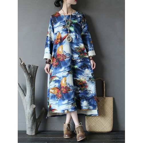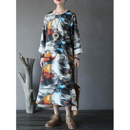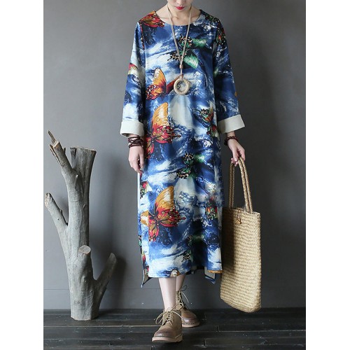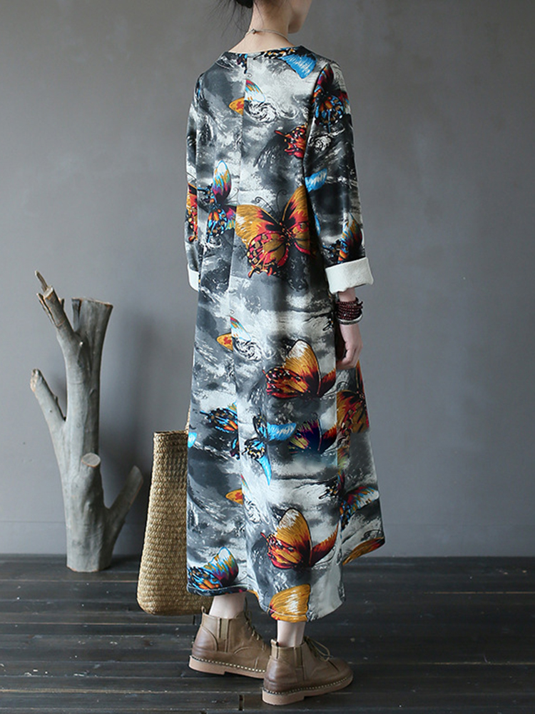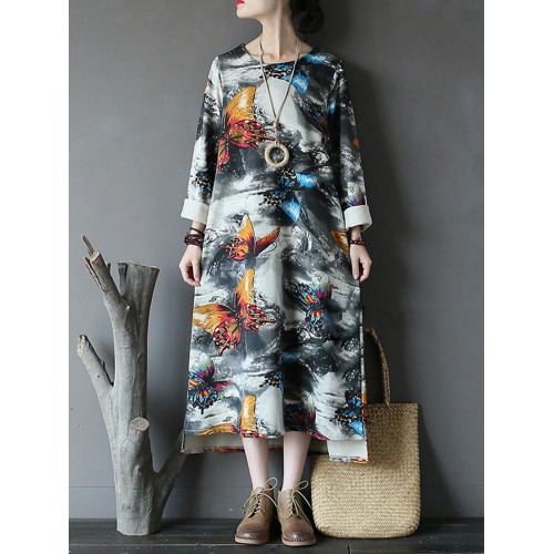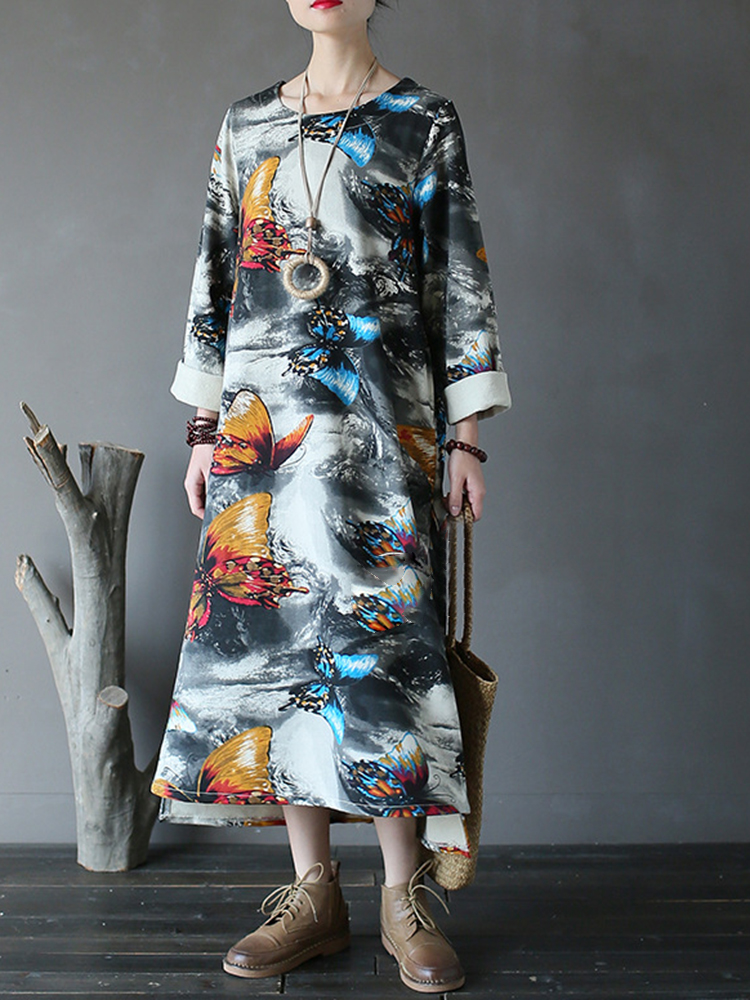 Vintage Women Butterfly Printed Long Sleeve Asymmetrical Sweatshirt Dress