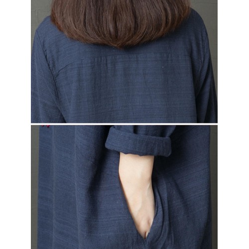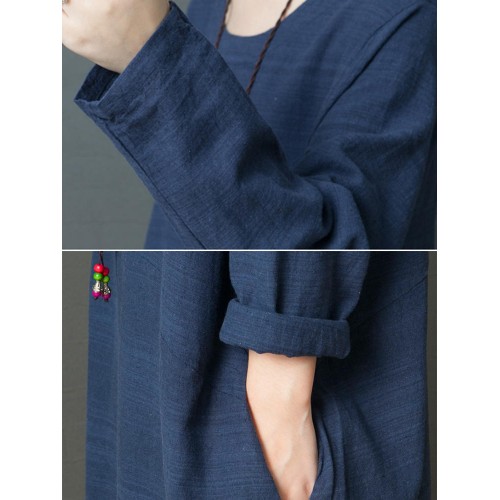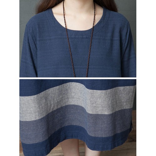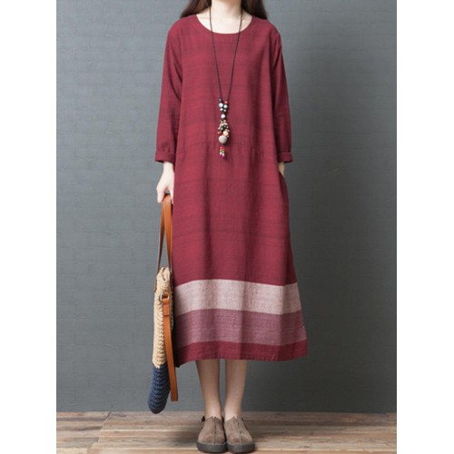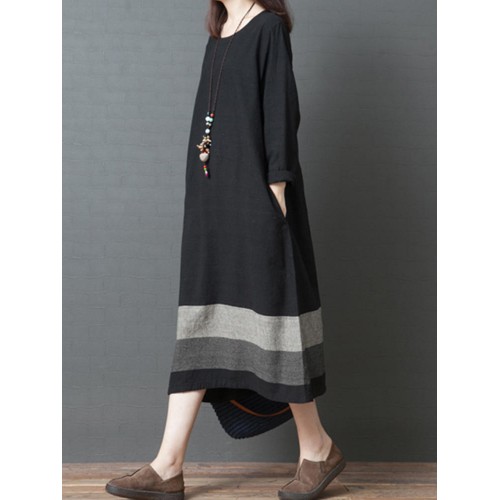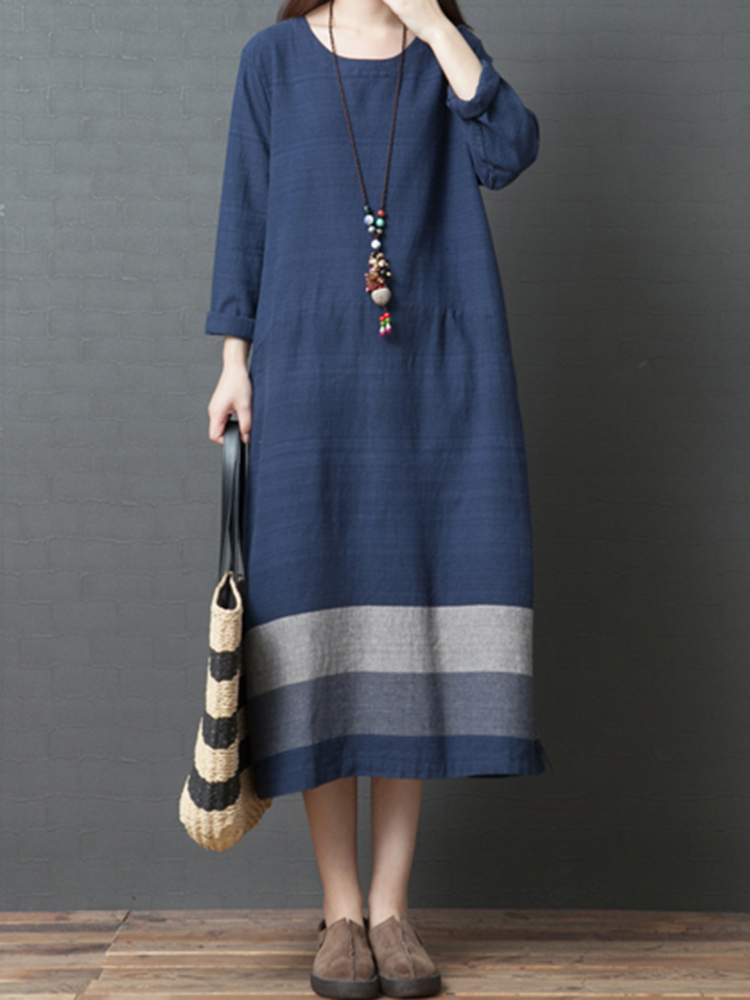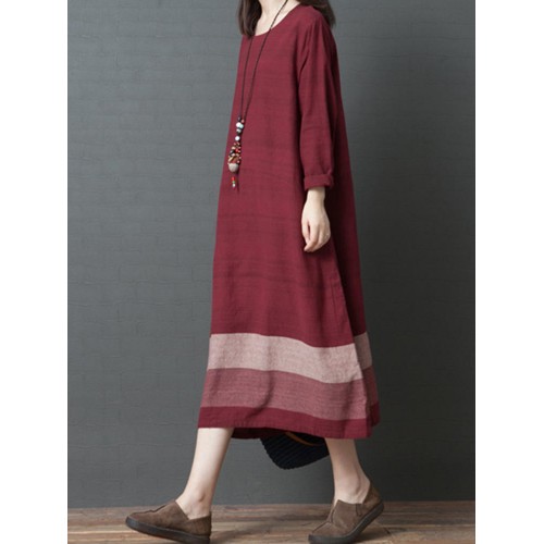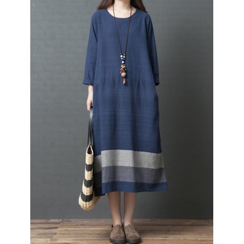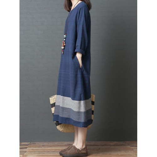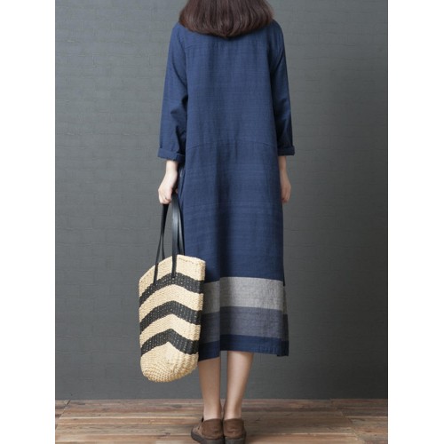 Vintage Women Loose Cotton Linen Striped Patchwork Long Sleeve Dress