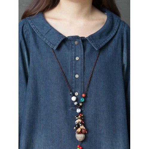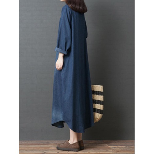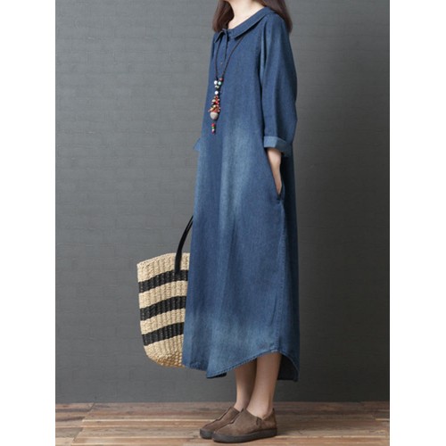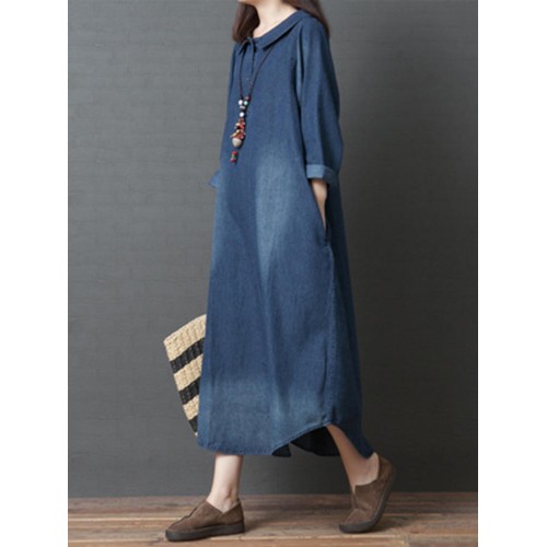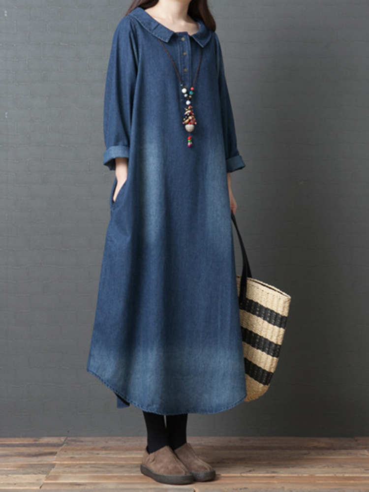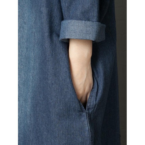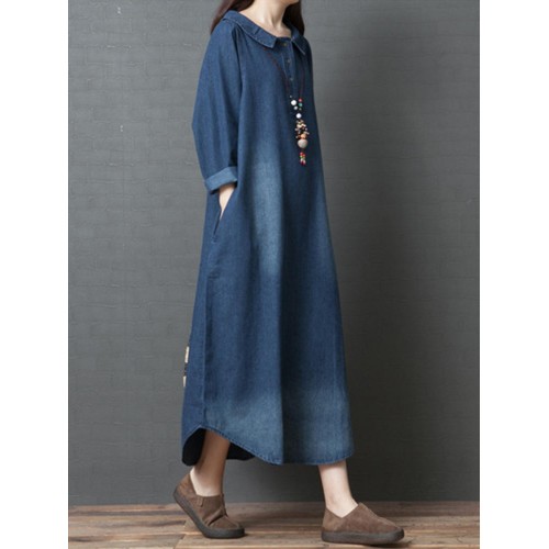 Women Long Sleeve Doll Collar Denim Blue Long Shirt Dress