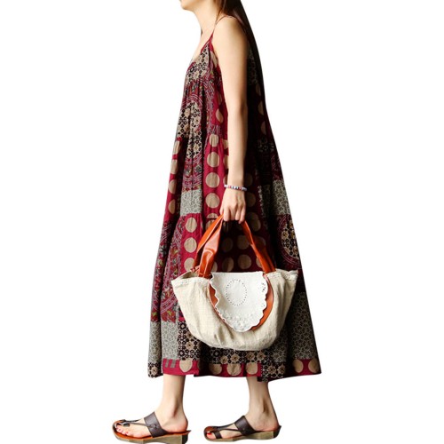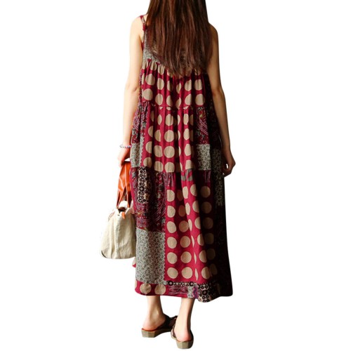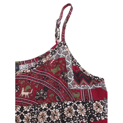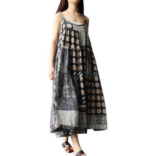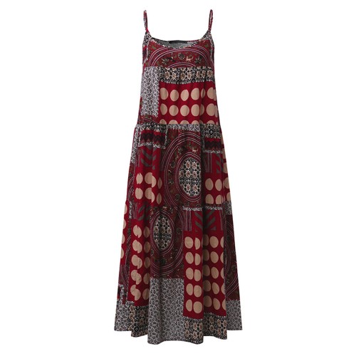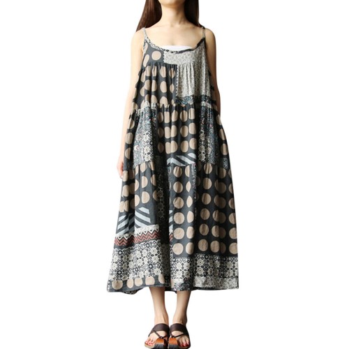 Women Sleeveless Spaghetti Strap Printed Loose Retro Maxi Dresses