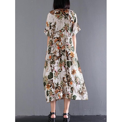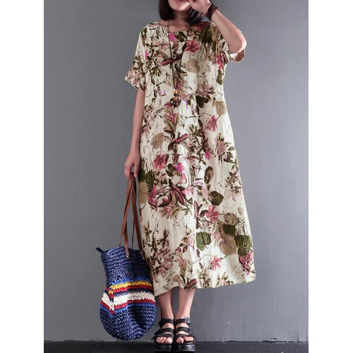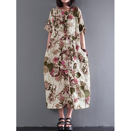 Women Vintage Retro Short Sleeve Cotton Floral Maxi Dress