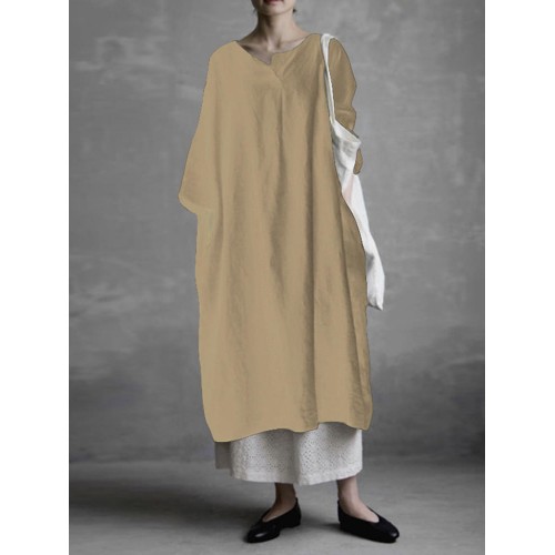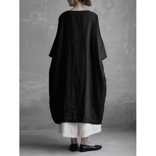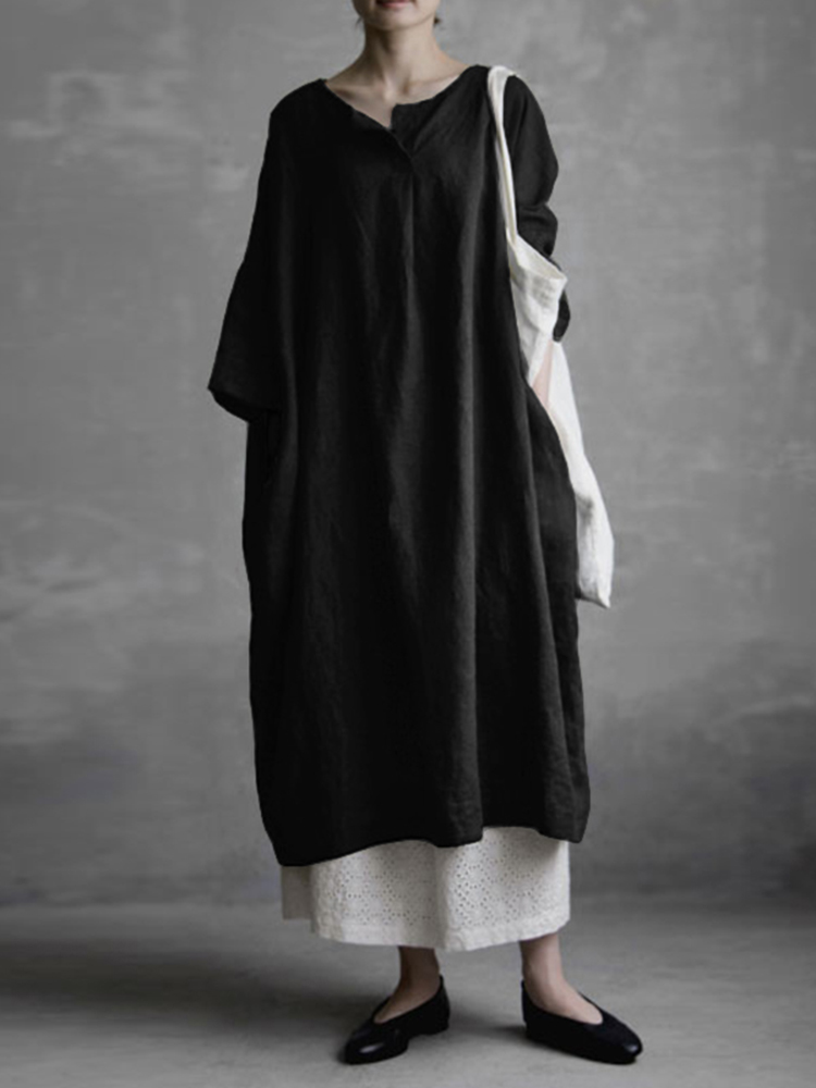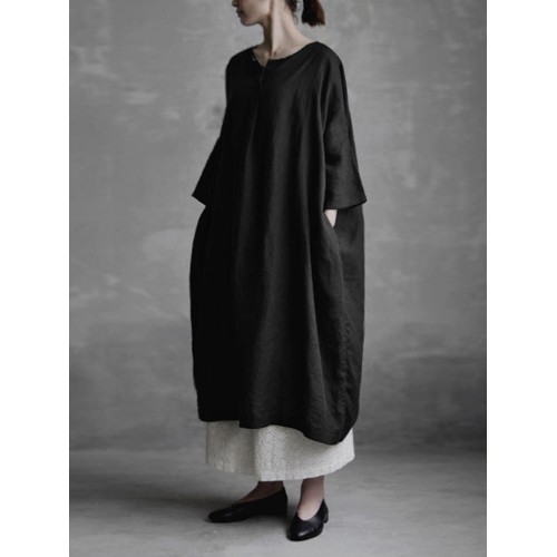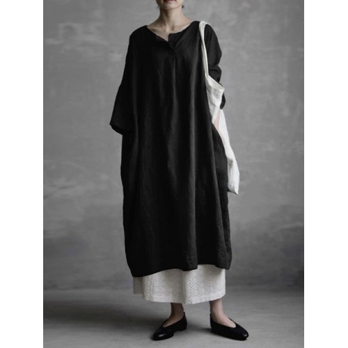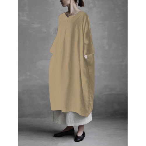 Women Vintage Solid Color Cotton Half Sleeve Dress