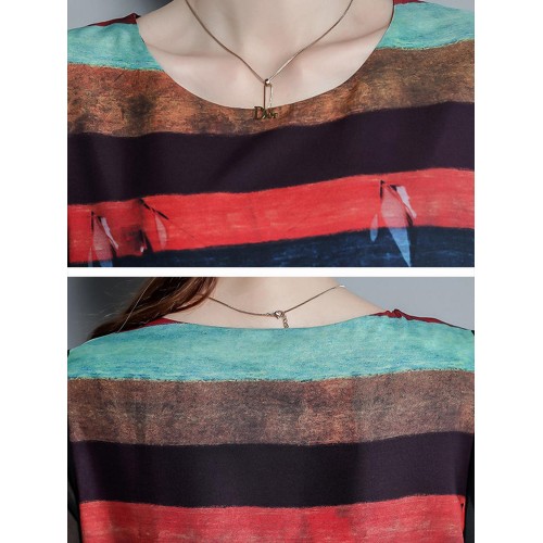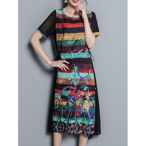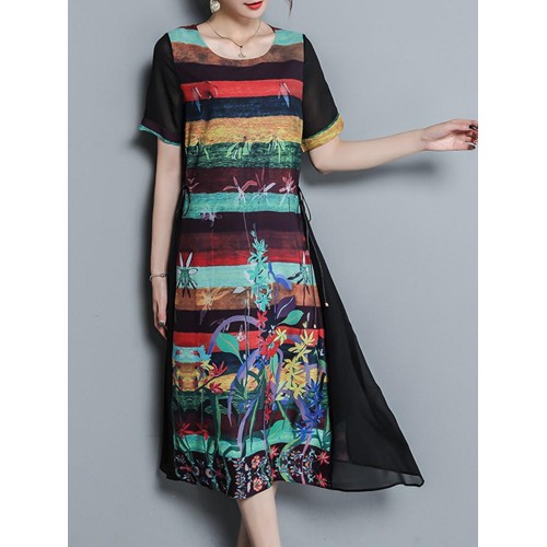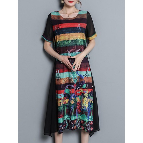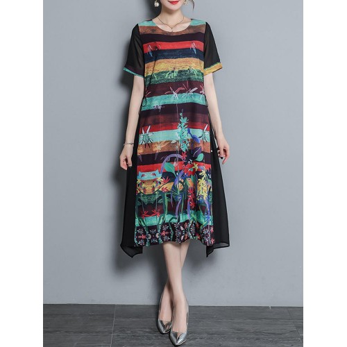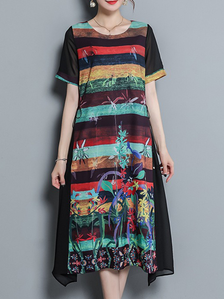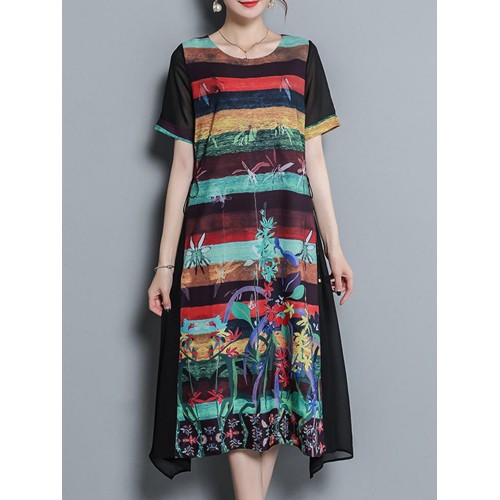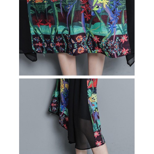 Vintage Women Floral Print O-neck Loose Irregular Hem Chiffon Dress