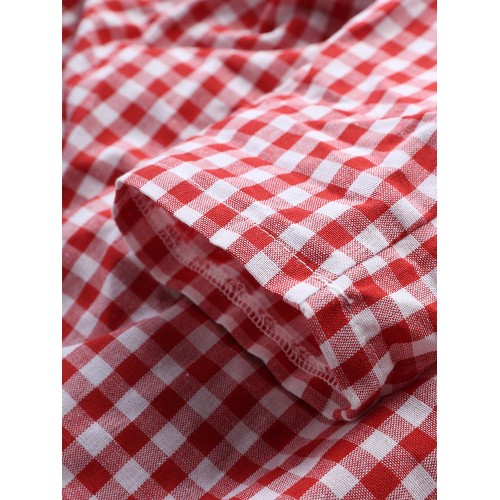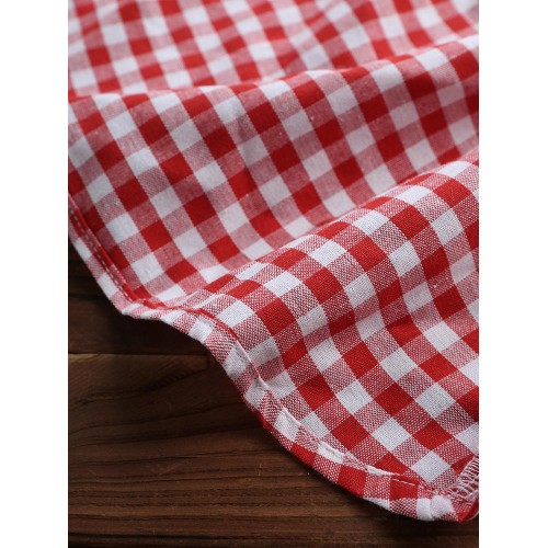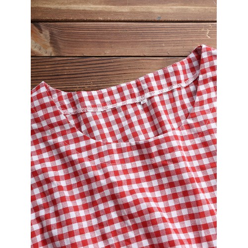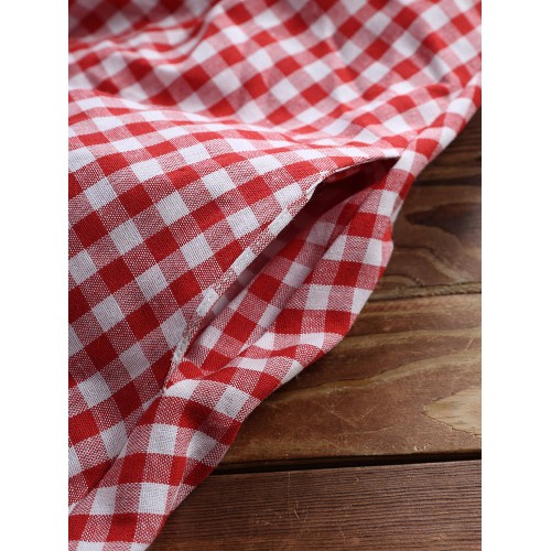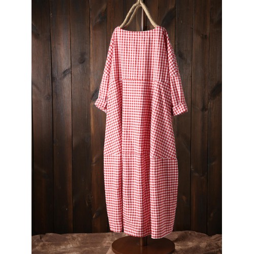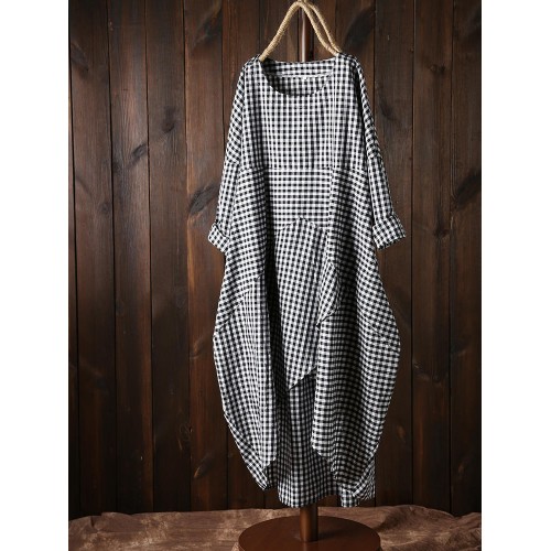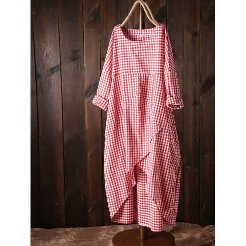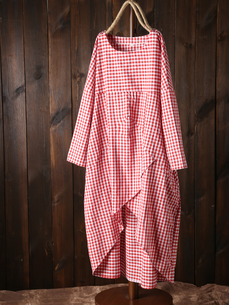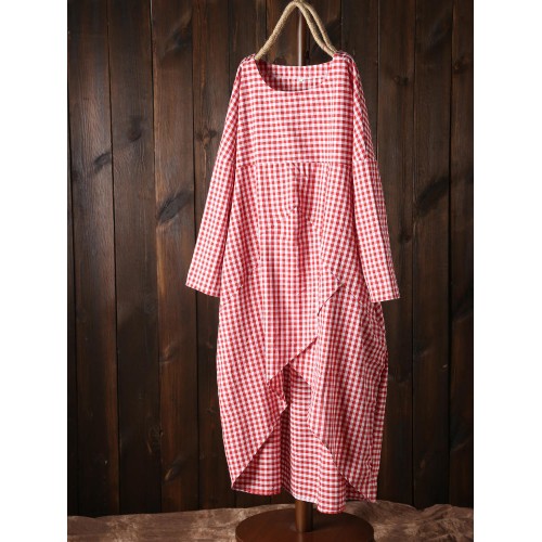 Women Plaid Irregular Hem Long Sleeve Dress with Pockets