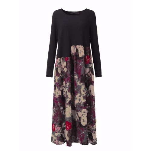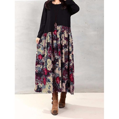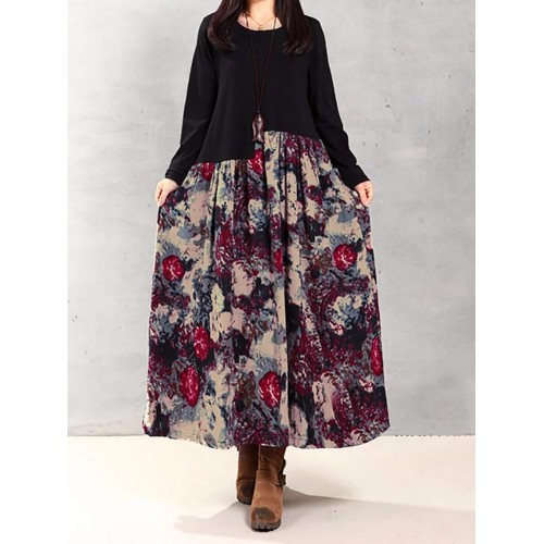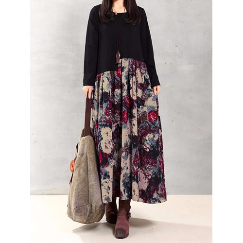 Vintage Women Floral Printed Patchwork Long Sleeve Maxi Dress