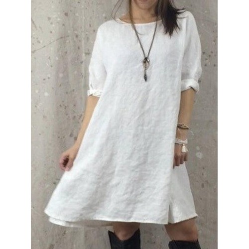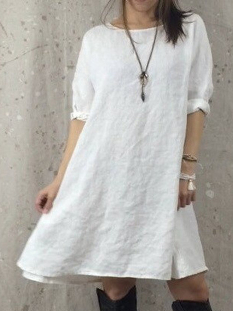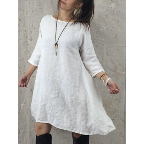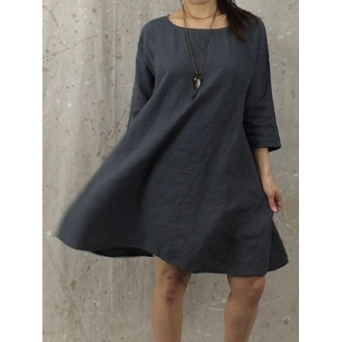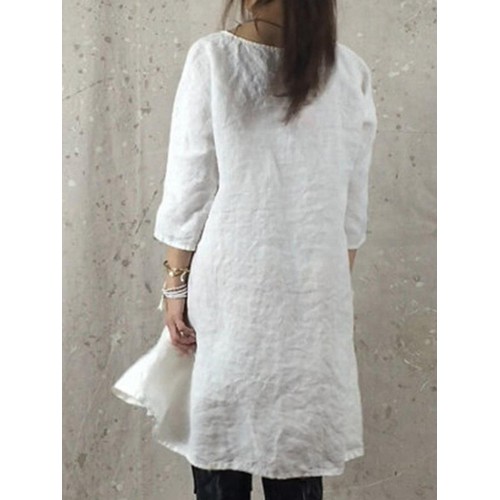 Women Casual Cotton Linen Pure Color 3/4 Sleeve Dress