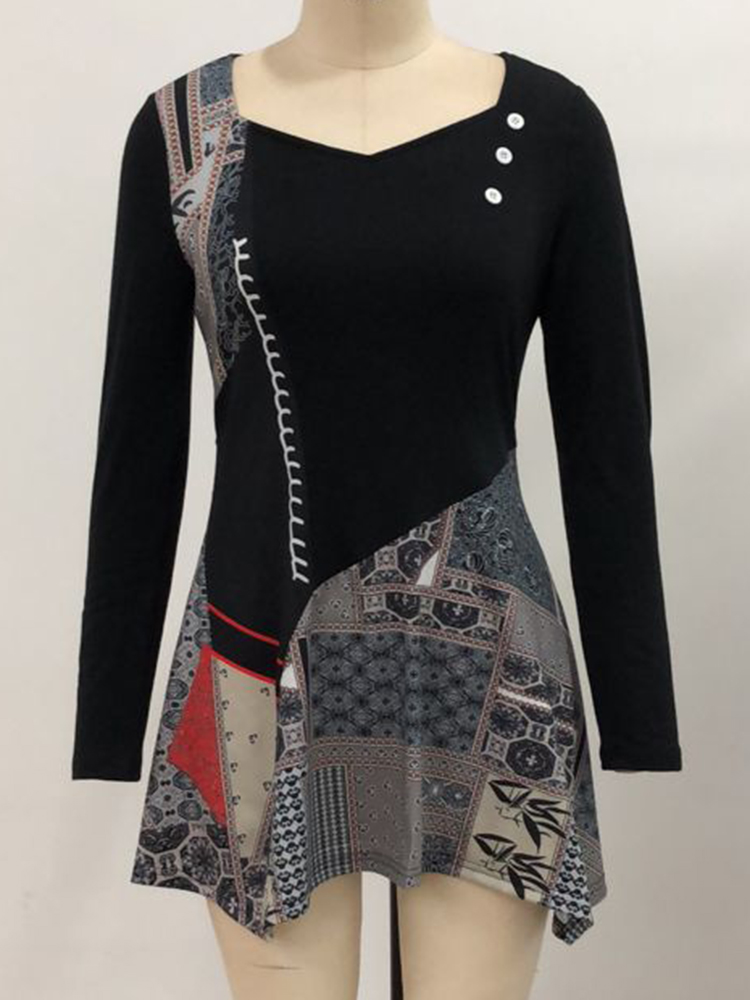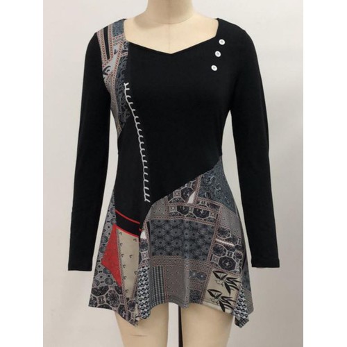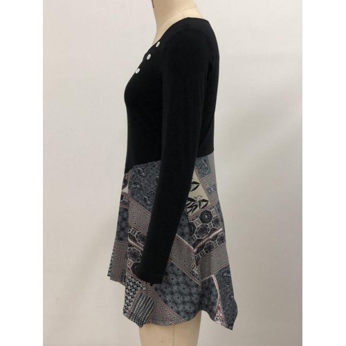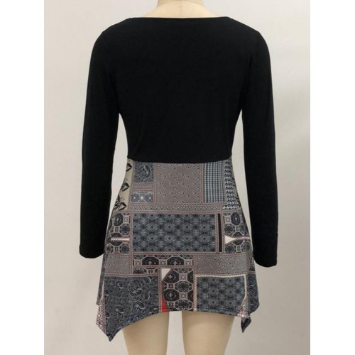 Vintage Women Print Patchwork Irregular Hem Mini Dress