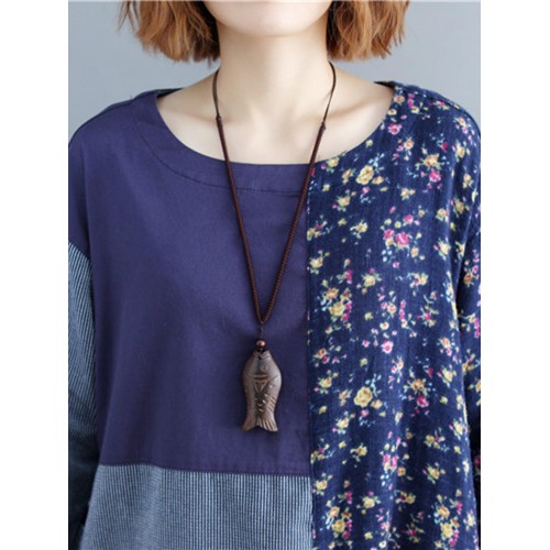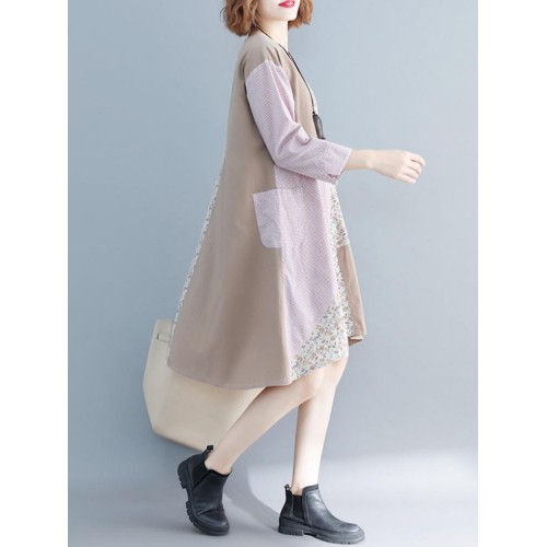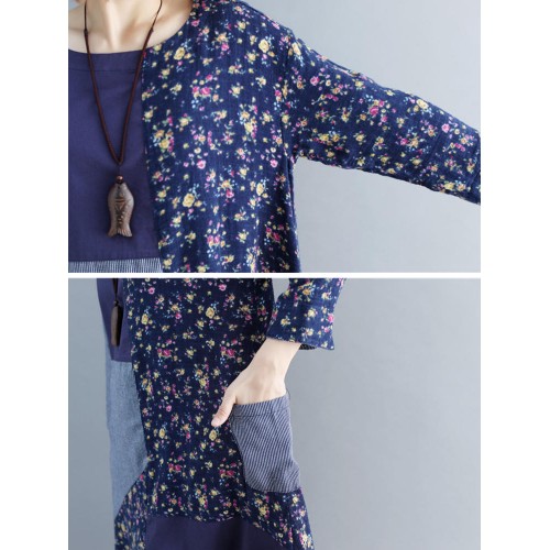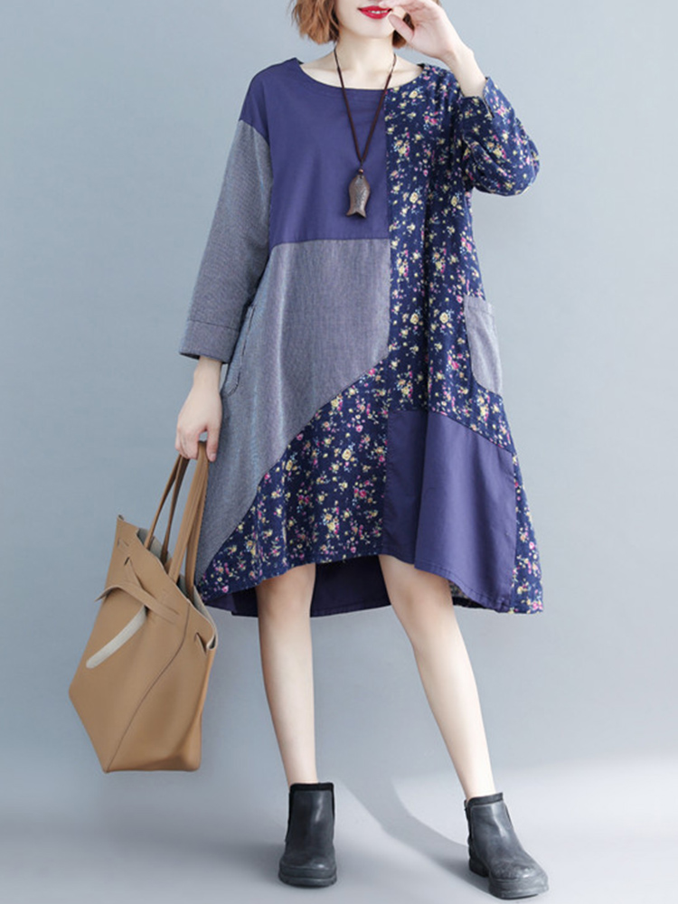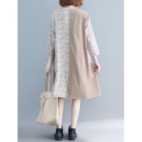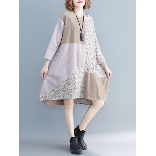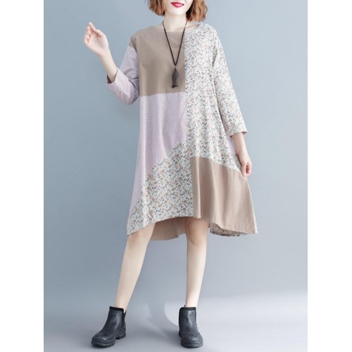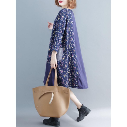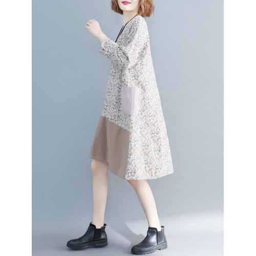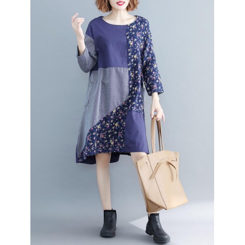 Vintage Women Cotton Linen Loose Print Patchwork Dress with Pockets