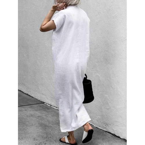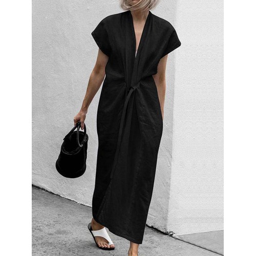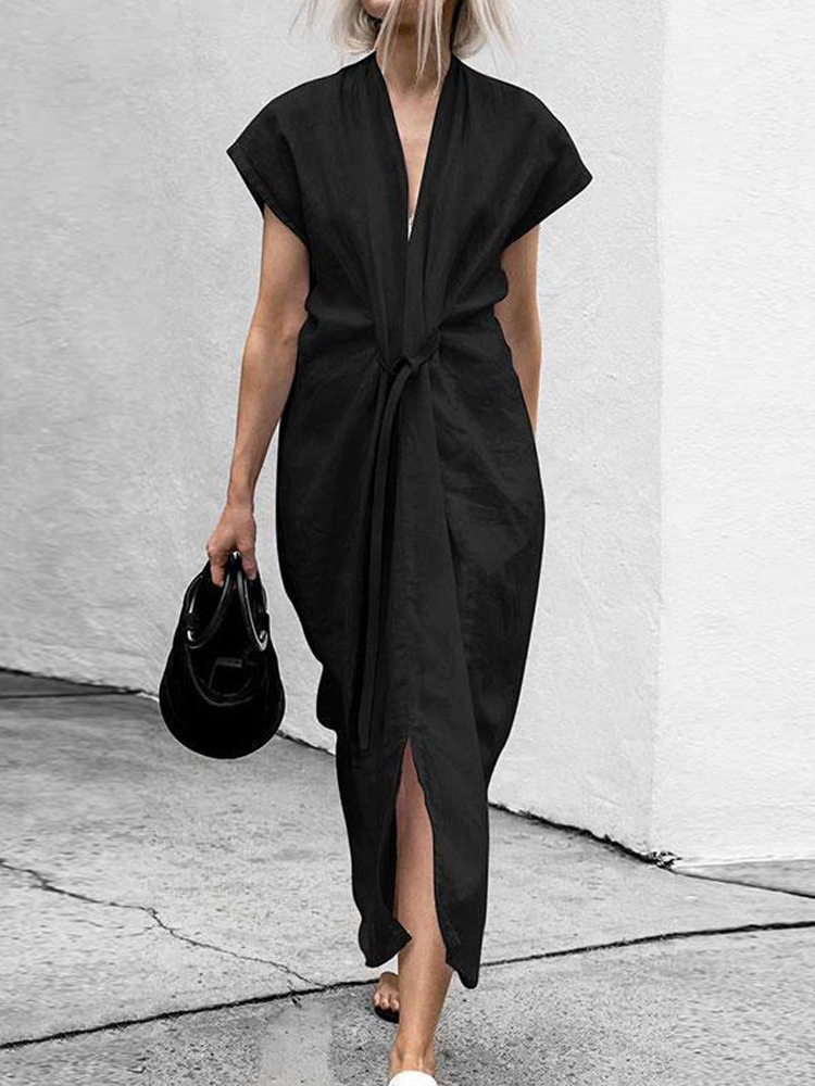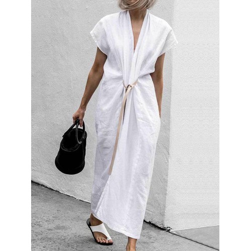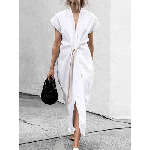 Women Short Sleeve V Neck Solid Belted Split Maxi Dress