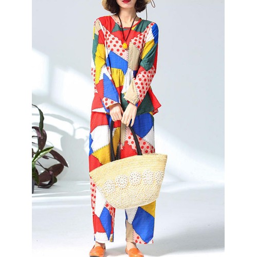 Women Vintage Floral Print Two Pieces Suits Long Sleeve Cotton Blouse Wide Leg Pants