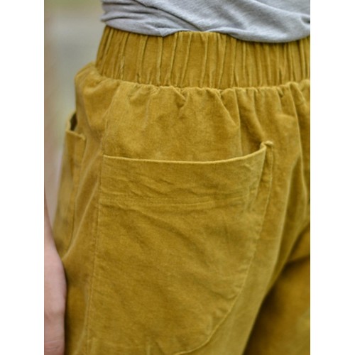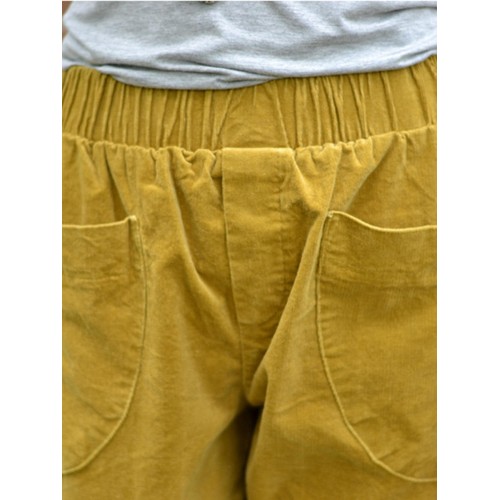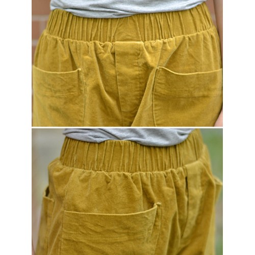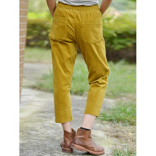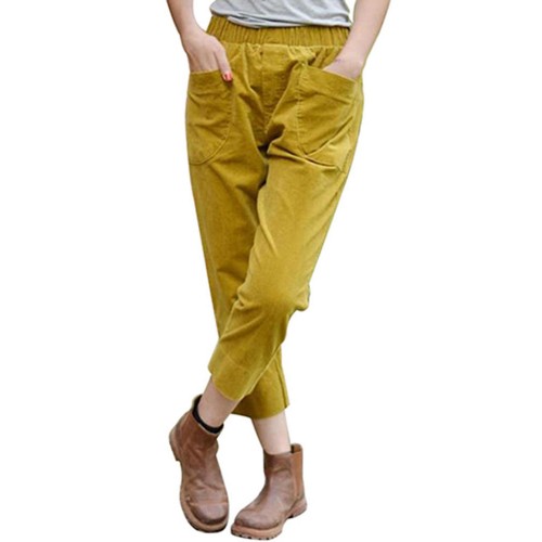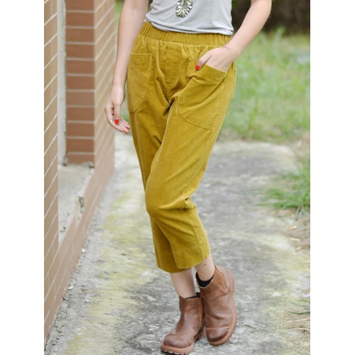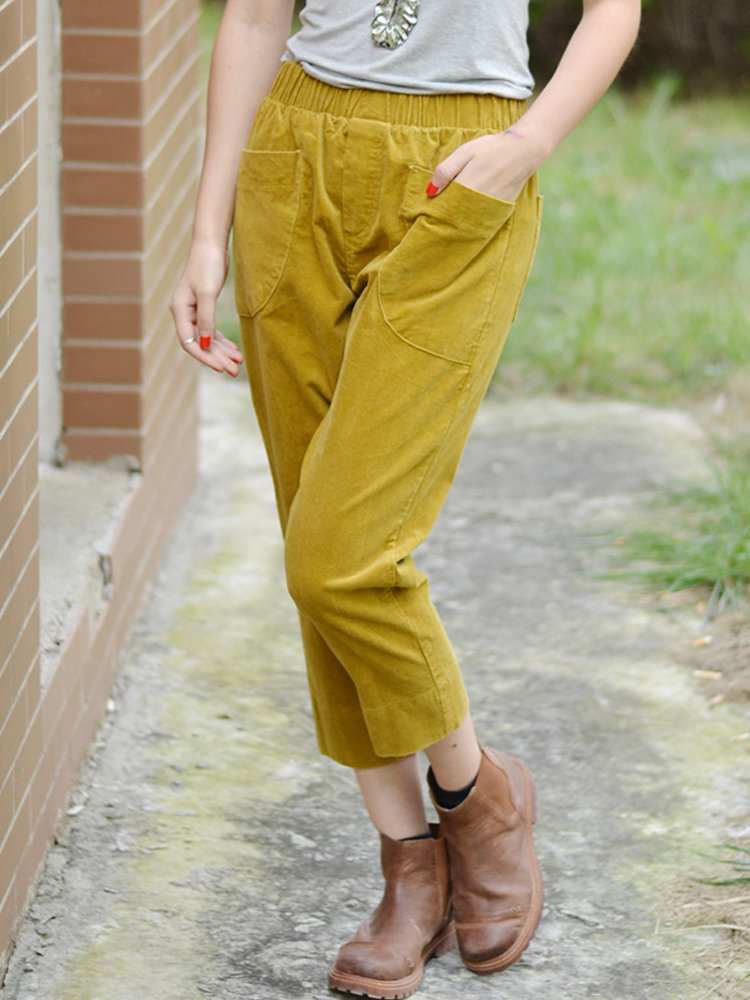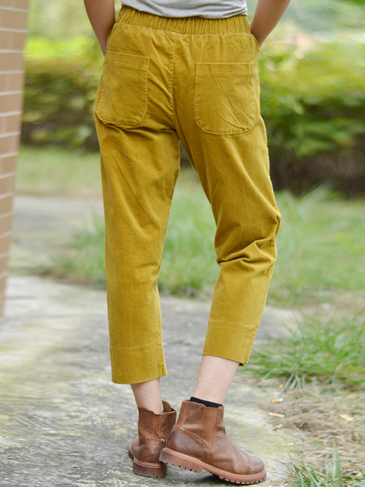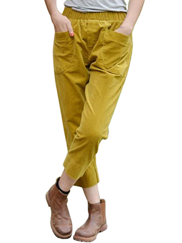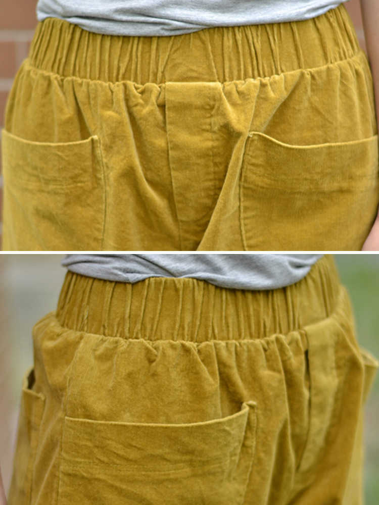 Women Solid Color Big Pocket Elastic Waist Corduroy Pants