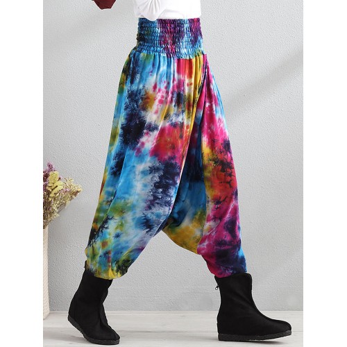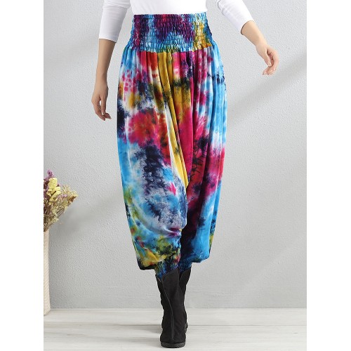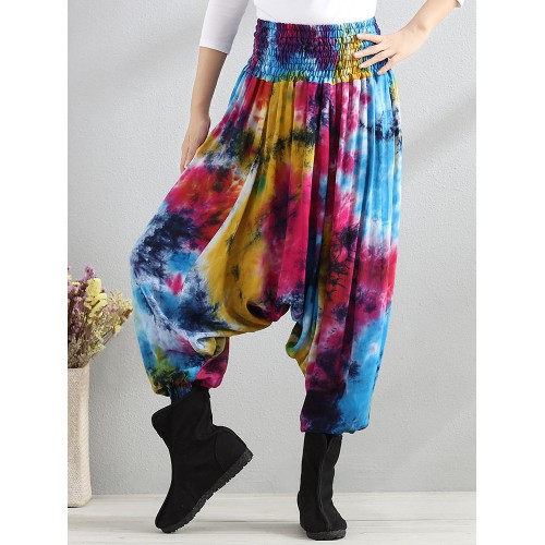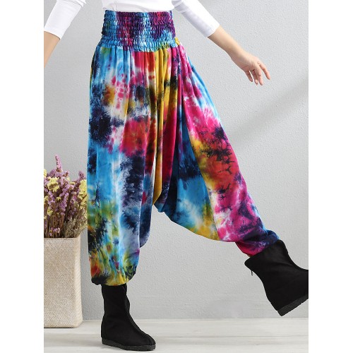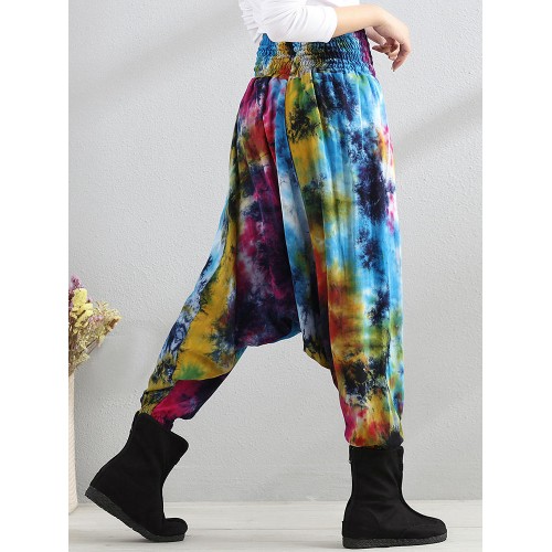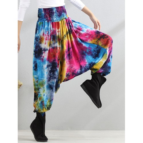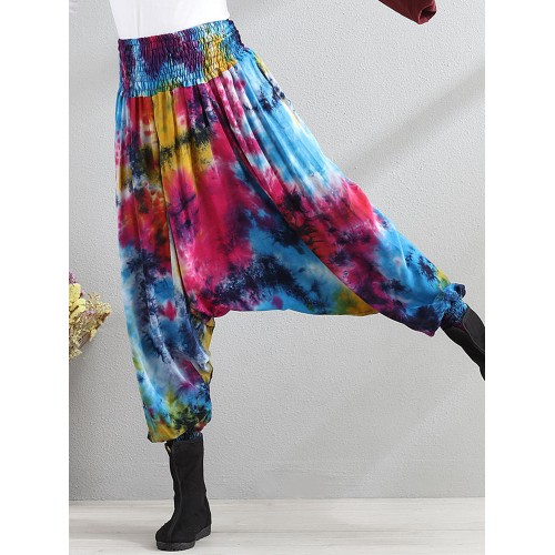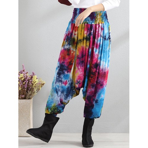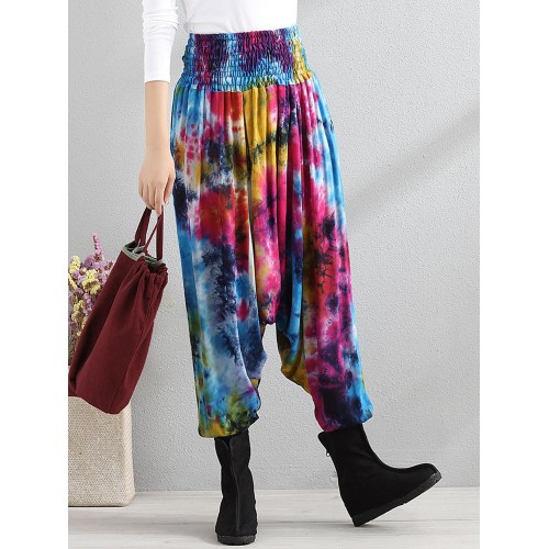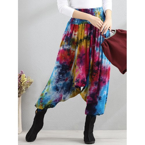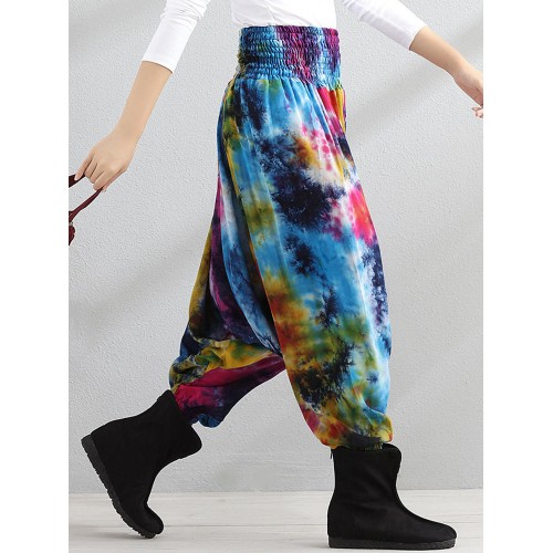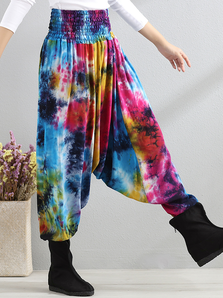 Retro Women Color-block Folk Style Elastic Waist Pants