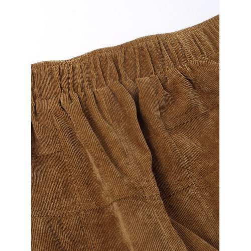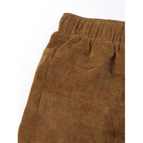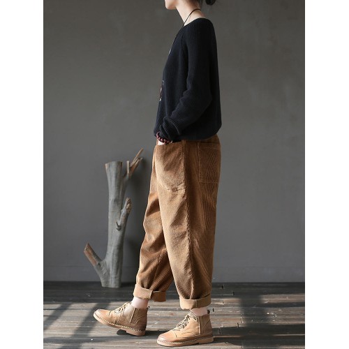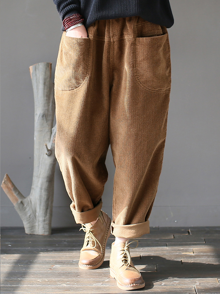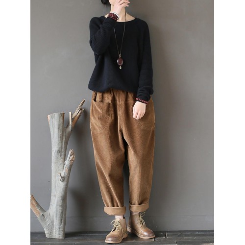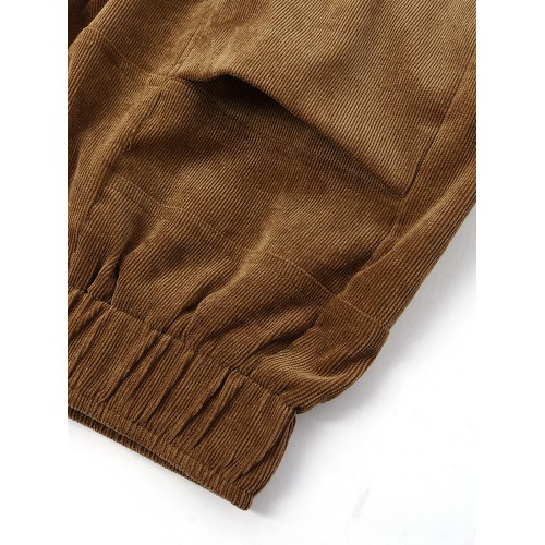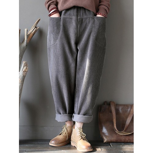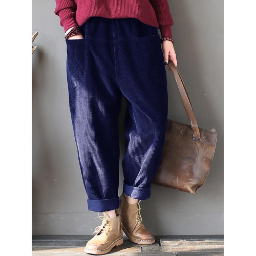 M-5XL Women Casual Pure Color Elastic Waist Corduroy Pants