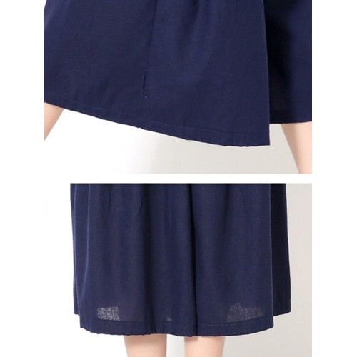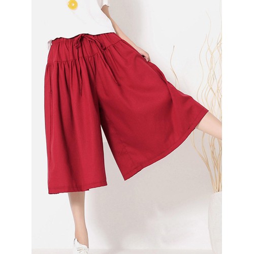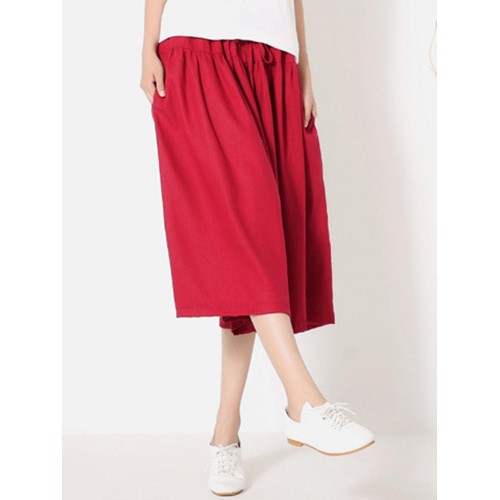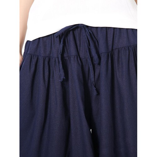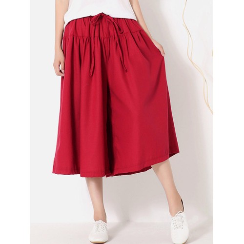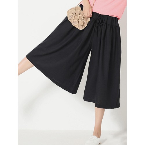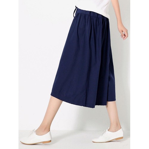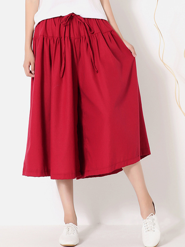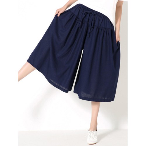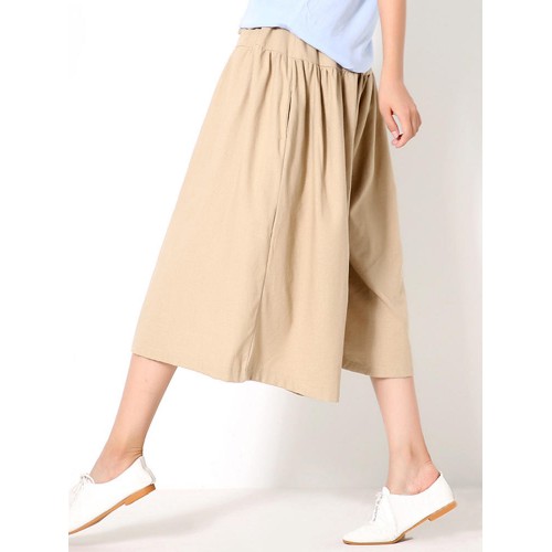 Wide Leg Women Pure Color Cotton Linen Elastic Waist Pants