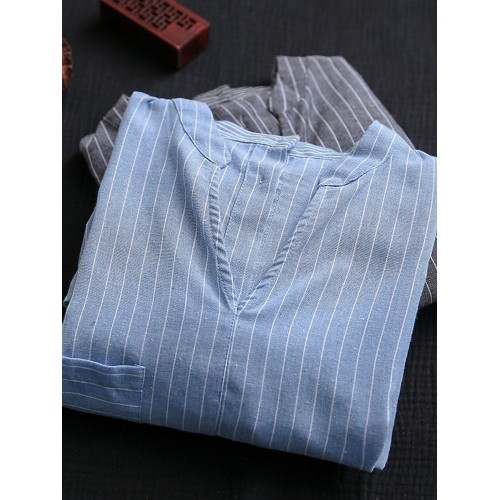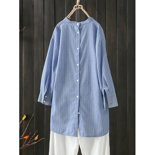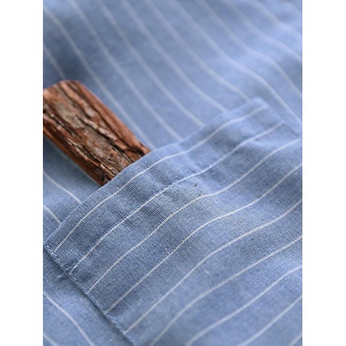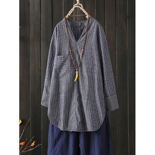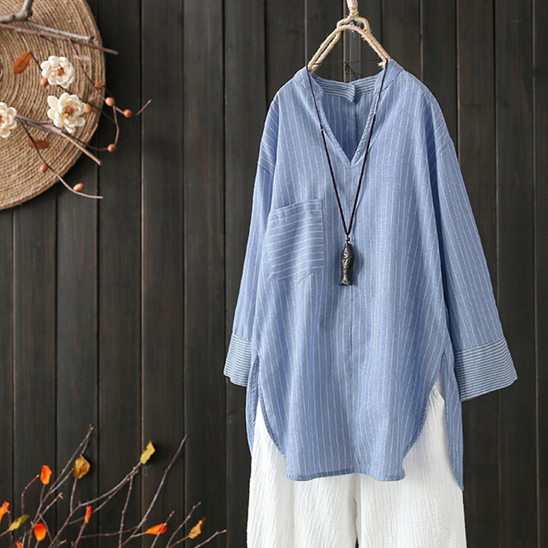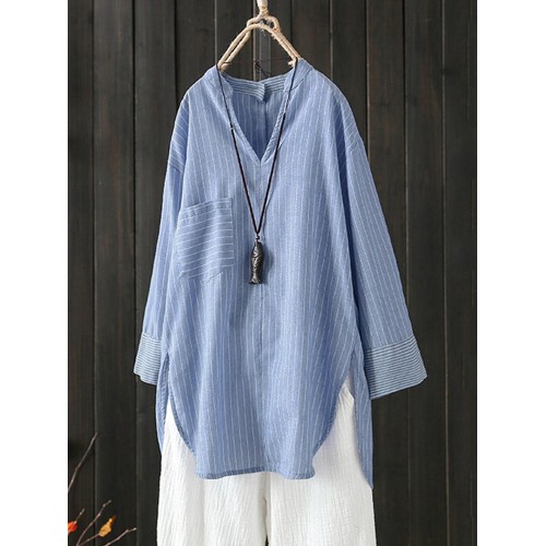 Vintage Women Striped Big Pocket Split Irregular Blouse