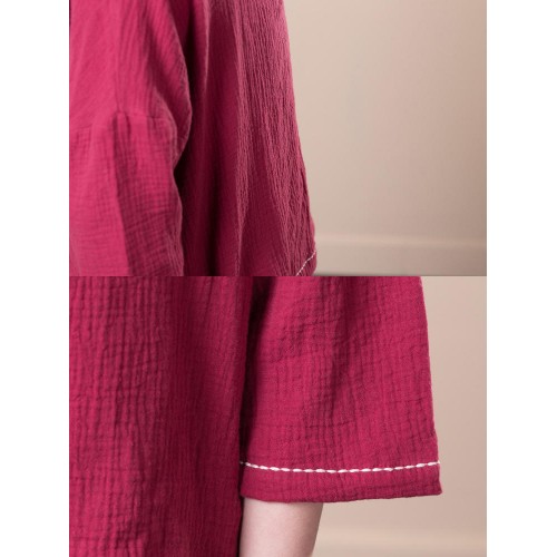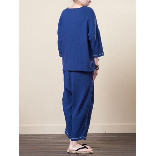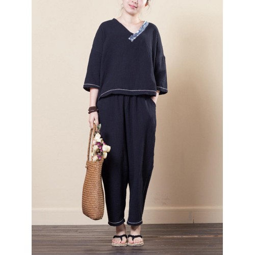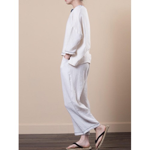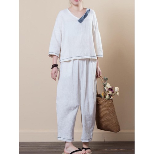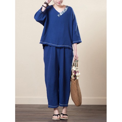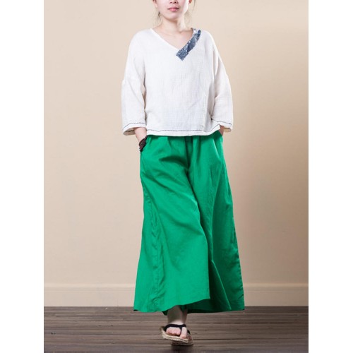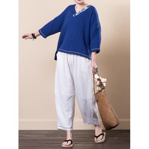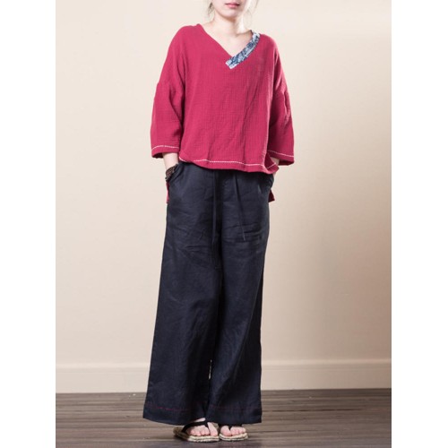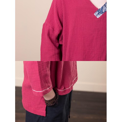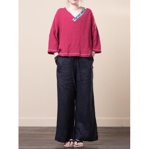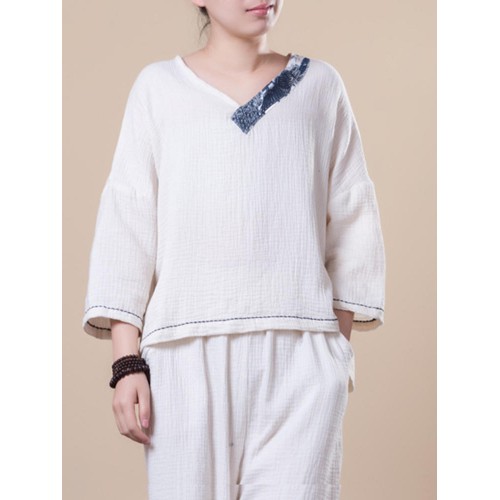 Chinese Style Printed V-neck Linen Cotton Blouse