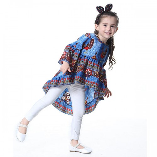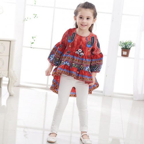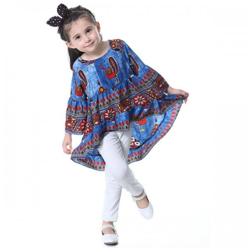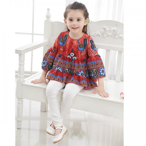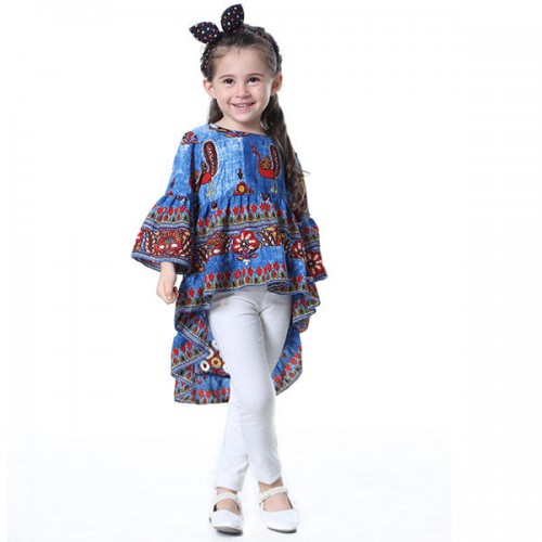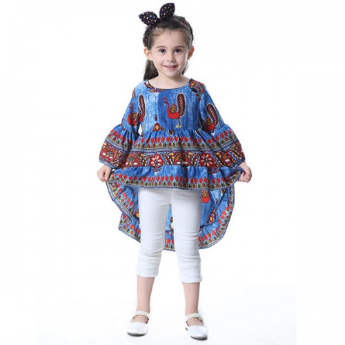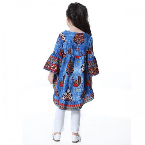 Kid Girls Peacock Printed Round Neck Bell-Sleeve Tops