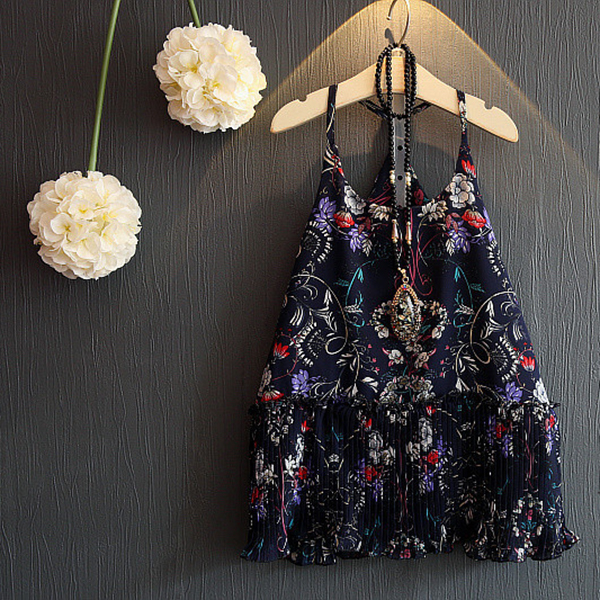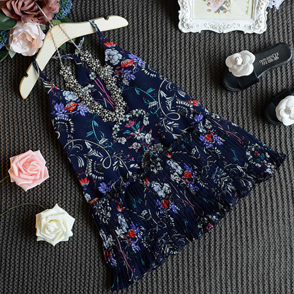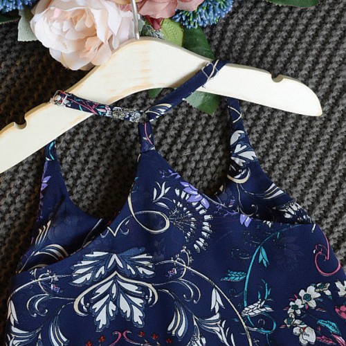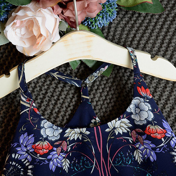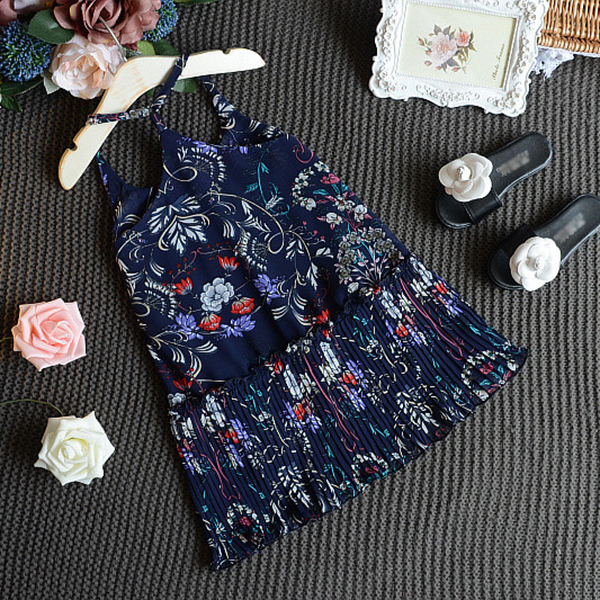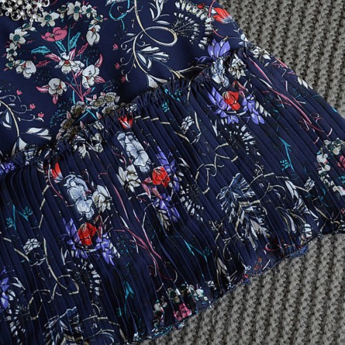Kid Girls Floral Printed Sleeveless Strap Chiffon Pleated Dress (Not Including Necklace)