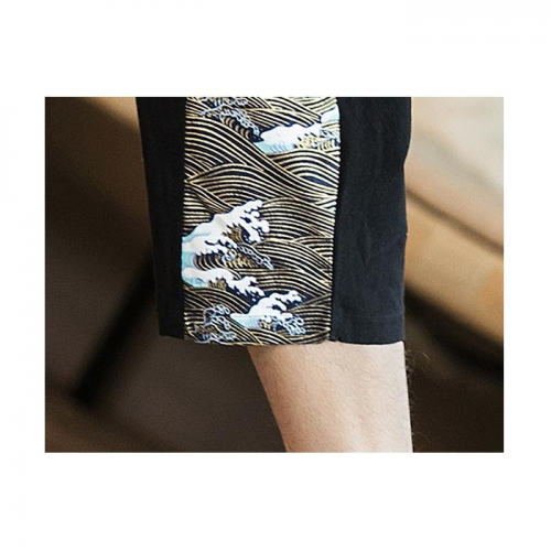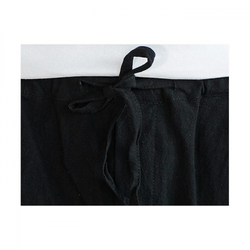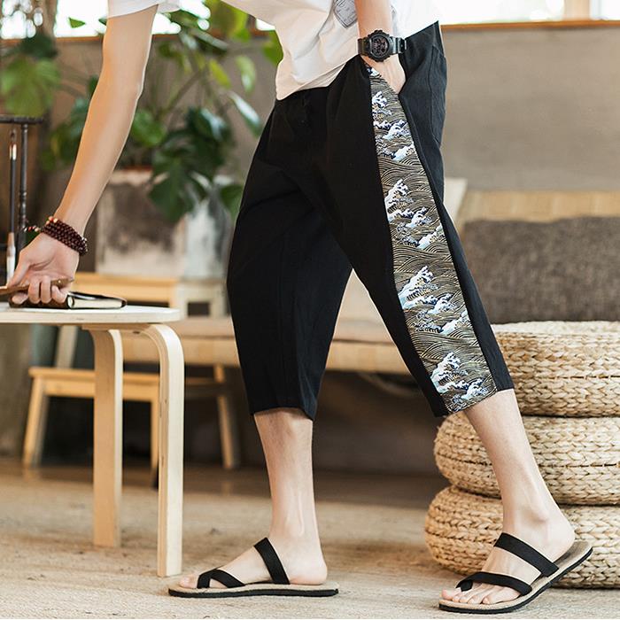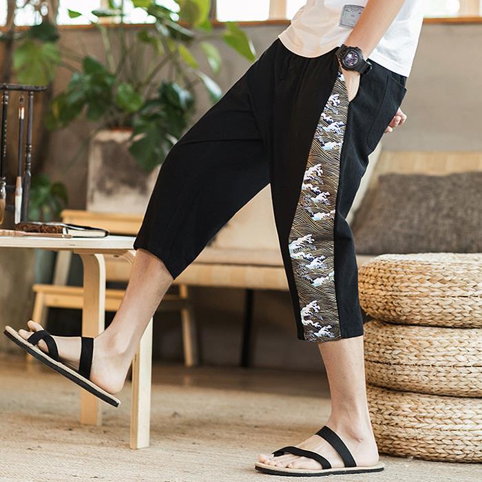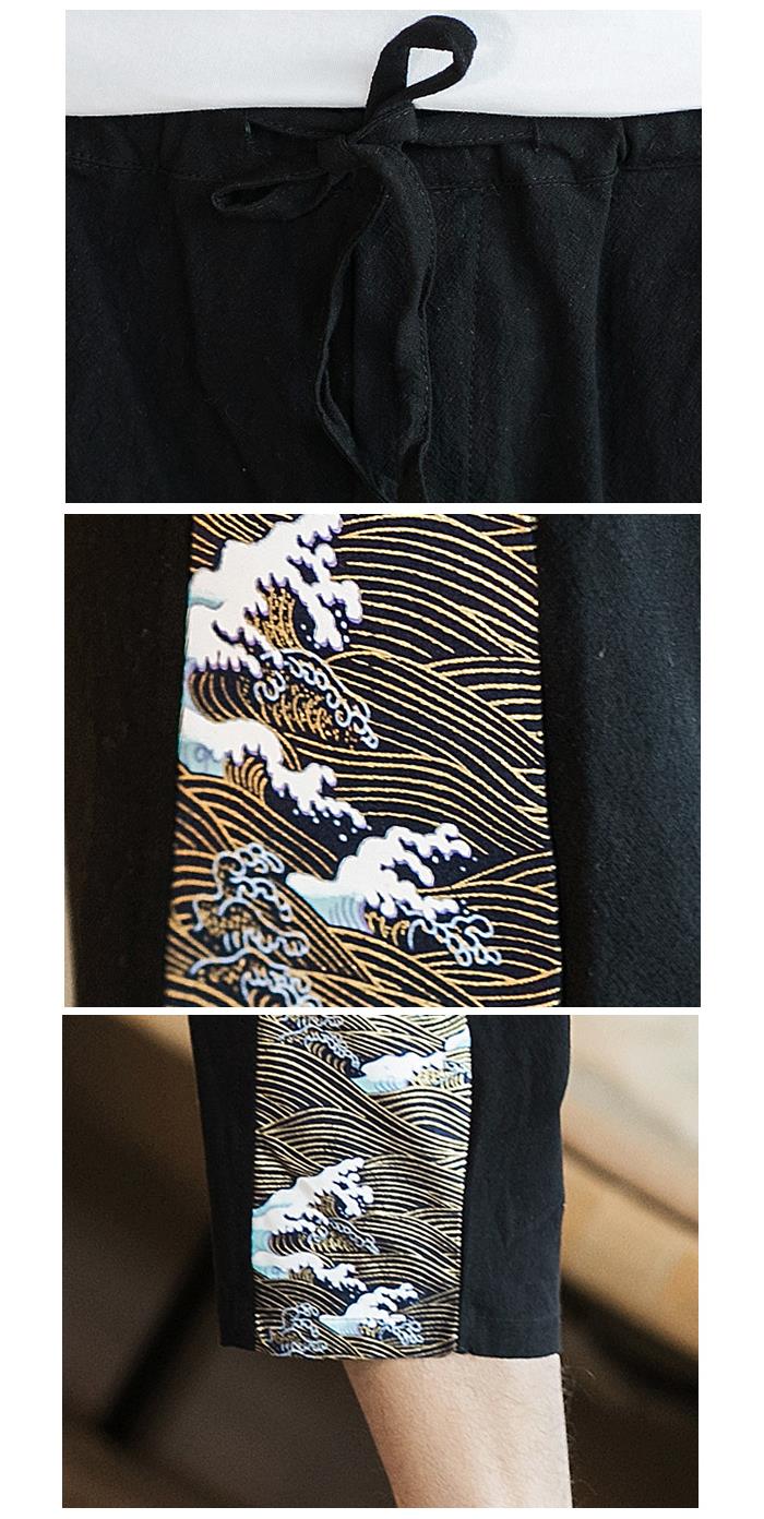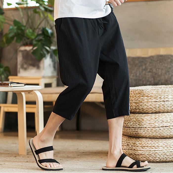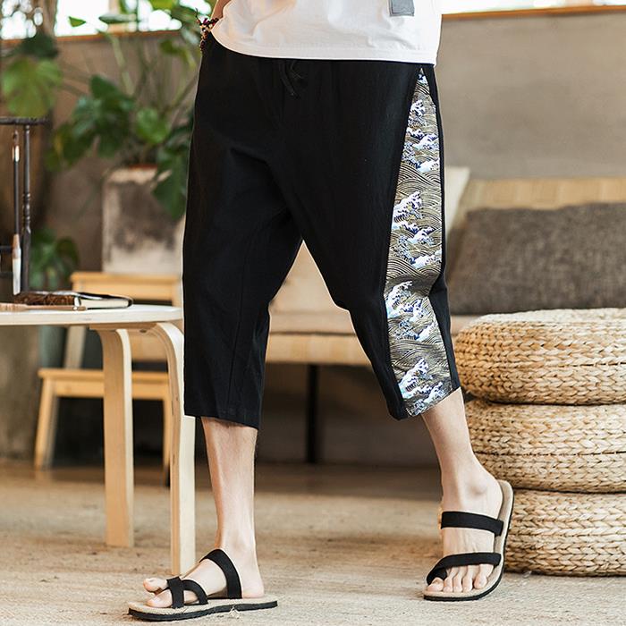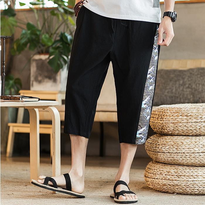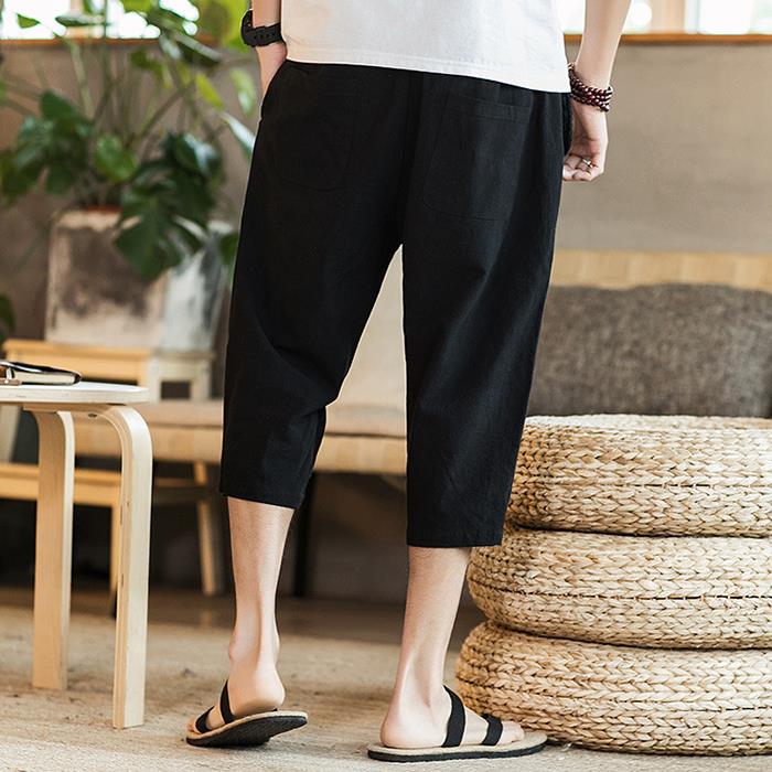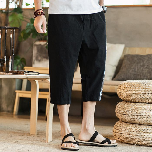 Attention: Please note that you should place your order in US size, however the tags inside the items will show in Asian size. Description: Item Type: Pants Fit Type: Loose Gender: Men Closure Type: Elastic Waist Material: Cotton, Linen Decoration: Pattern Style: Chinese Style Thickness: Standard Waist Type: Mid Rise Season: Spring, Summer Pants Type: Wide Leg Pants Color: Black Length: Calf-Length Occasion: Leisure, Homedress