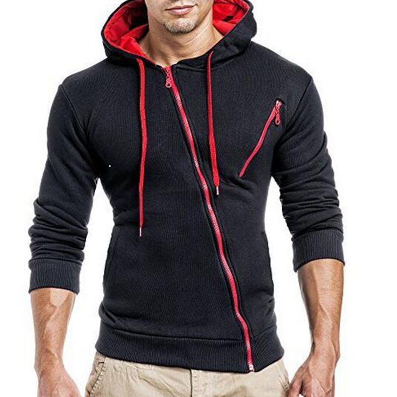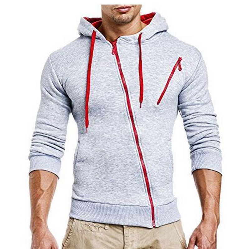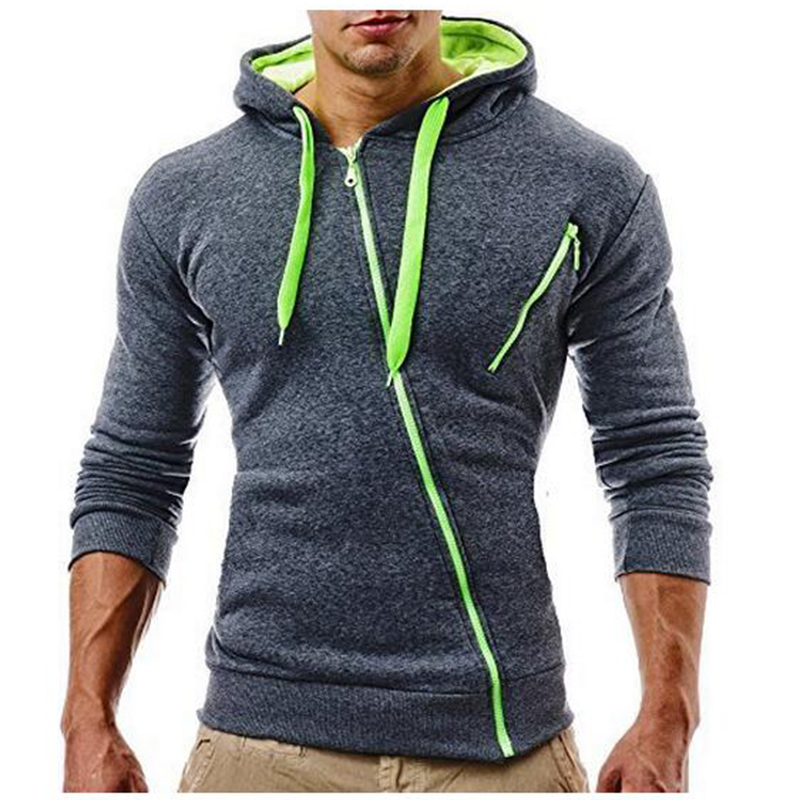 Men's Fashion Fit Diagonal Zipper Design Pure Color Hooded Long Sleeve Sweatshirt