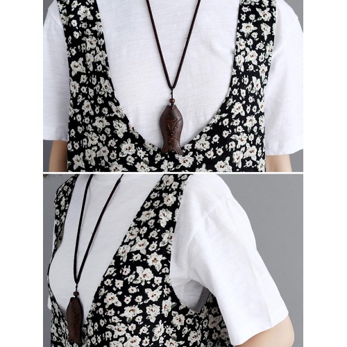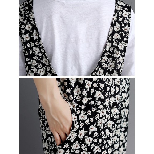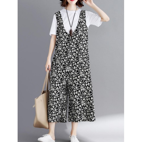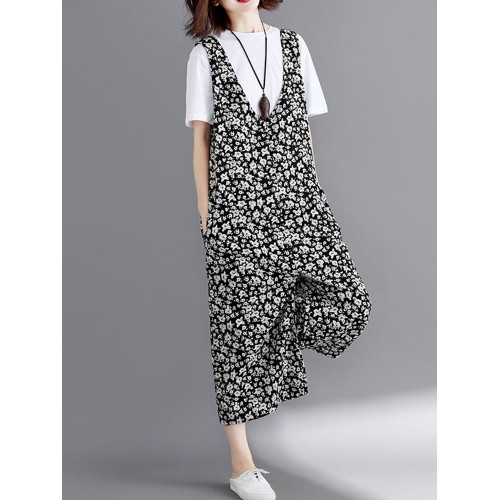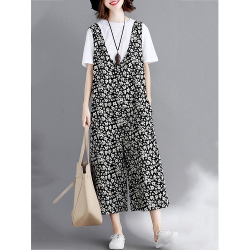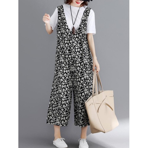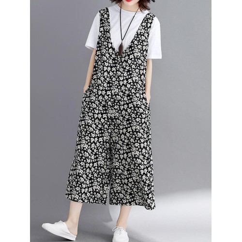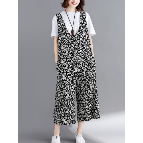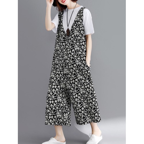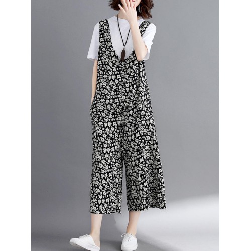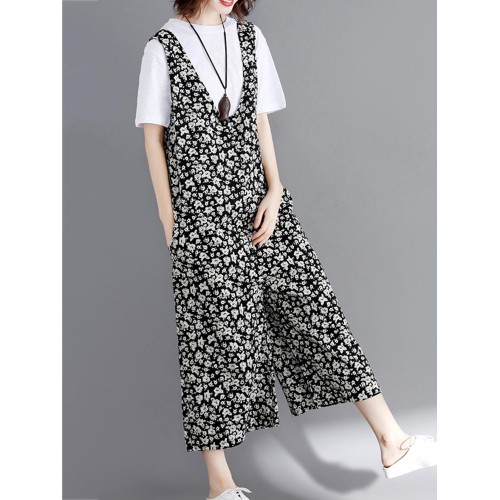 Wide Leg Women Cotton Loose Floral Print Sleeveless Jumpsuit