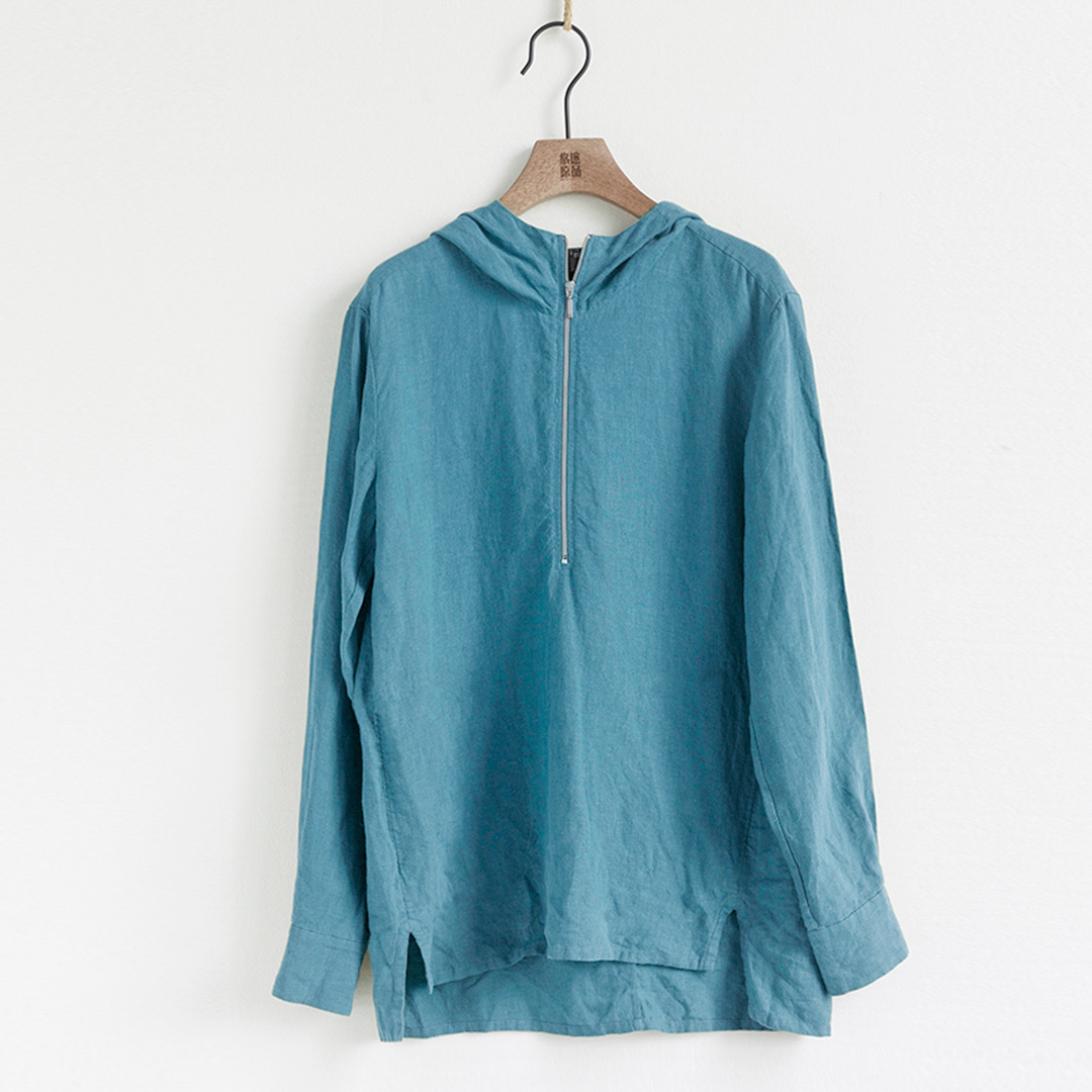 Mens Cotton Loose Hooded Tops Zipper Long Sleeve Solid Color T-Shirts
