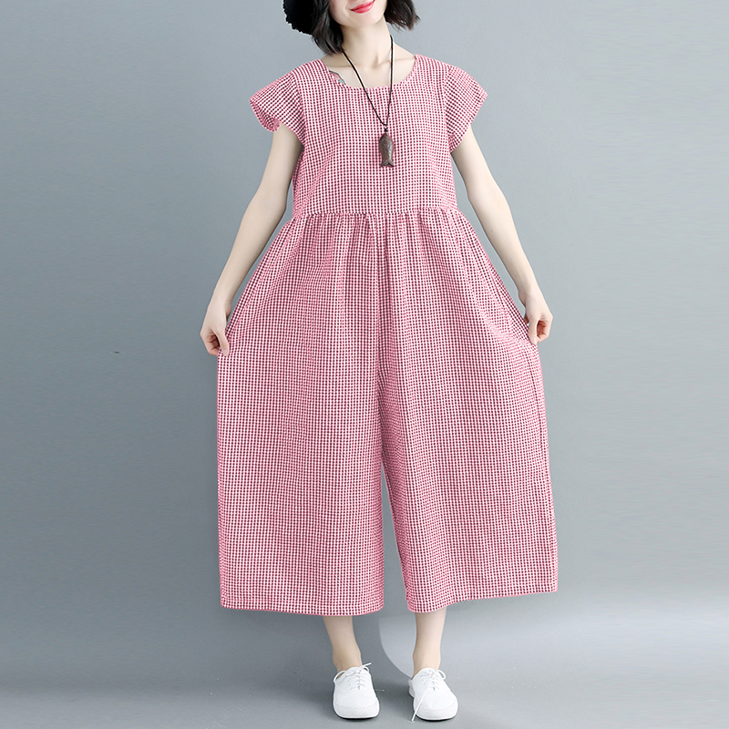 Women Short Sleeve O-neck Wide Leg Pant Loose Casual Plaid Jumpsuit